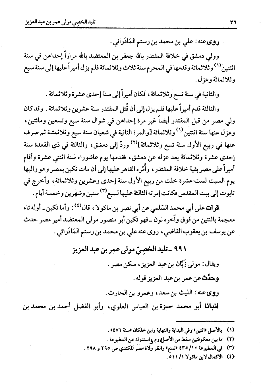 روى عنه علي بن محمد بن رستم المادرائي وولي دمشق في خلافة المقتدر بالله جعفر بن المعتضد بالله مرارا إحداهن في سنة اثنتين (1) وثلاثمائة وقدمها في المحرم سنة ثلاث وثلاثمائة فلم يزل أميرا عليها إلى سنة سبع وثلاثمائة وعزل والثانية في سنة تسع وثلاثمائة فكان أميرا إلى سنة إحدى عشرة وثلاثمائة والثالثة قدم أميرا عليها فلم يزل إلى أن قتل المقتدر سنة عشرين وثلاثمائة وقد كان ولي مصر من قبل المقتدر أيضا غير مرة إحداهن في شوال سنة سبع وتسعين ومائتين وعزل عنها سنة اثنتين (1) وثلاثمائة والمرة الثانية في شعبان سنة سبع وثلاثمائة ثم صرف عنها في ربيع الأول سنة تسع وثلاثمائة (2) ورد إلى دمشق والثالثة في ذي القعدة سنة إحدى عشرة وثلاثمائة بعد عزله عن دمشق فقدمها يوم عاشوراء سنة اثنتي عشرة وأقام أميرا على مصر بقية خلافة المقتدر وأمره القاهر عليها إلى أن مات تكين بمصر وهو واليها يوم السبت لست عشرة خلت من ربيع الأول سنة إحدى وعشرين وثلاثمائة وأخرج في تابوت إلى بيت المقدس فكانت إمرته الثالثة عليها لسبع (3) سنين وشهرين وخمسة أيام قرأت على أبي محمد السلمي عن أبي نصر بن ماكولا قال (4) وأما تكين أوله تاء معجمة باثنتين من فوق وآخره نون فهو تكين أبو منصور مولى المعتضد أمير مصر حدث عن يوسف بن يعقوب القاضي روى عنه علي بن محمد بن رستم المادرائي