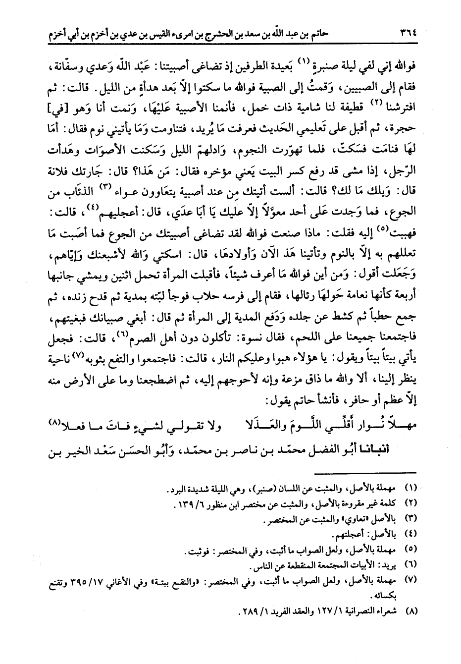 فوالله إني لفي ليلة صنبرة (1) بعيدة الطرفين إذ تضاغى أصبيتنا عبد الله وعدي وسفانة فقام إلى الصبيين وقمت إلى الصبية فوالله ما سكتوا إلا بعد هدأة من الليل قالت ثم افترشنا (2) قطيفة لنا شامية ذات خمل فأنمنا الأصبية عليها ونمت أنا وهو في حجرة ثم أقبل على تعليمي الحديث فعرفت ما يريد فتناومت وما يأتيني نوم فقال أما لها قامت فسكت فلما تهورت النجوم وادلهم الليل وسكنت الأصوات وهدأت الرجل إذا مشى قد رفع كسر البيت يعني مؤخره فقال من هذا قال جارتك فلانة قال ويلك ما لك قالت ألست أتيتك من عند أصبية يتعاوون عواء (3) الذئاب من الجوع فما وجدت على أحد معولا إلا عليك يا أبا عدي قال أعجليهم قالت فهببت (5) إليه فقلت ماذا صنعت فوالله لقد تضاغى أصبيتك من الجوع فما أصبت ما تعللهم به إلا بالنوم وتأتيني هذه الآن وأولادها قال اسكتي والله لأشبعنك وإياهم وجعلت أقول ومن أين فوالله ما أعرف شيئا فأقبلت المرأة تحمل اثنين ويمشي جانبها أربعة كأنها نعامة حولها رئالها فقام إلى فرسه حلاب فوجأ لبته بمدية ثم قدح زنده ثم جمع حطبا ثم كشط عن جلده ودفع المدية إلى المرأة ثم قال أبغي صبيانك فبغيتهم فاجتمعنا جميعنا على اللحم فقال نسوة تأكلون دون أهل الصرم (6) قالت فجعل يأتي بيتا بيتا ويقول يا هؤلاء هبوا وعليكم النار قالت فاجتمعوا والتفع بثوبه ناحية ينظر إلينا ألا والله ماذاق مزعة وإنه لأحوجهم إليه ثم اضطجعنا وما على الأرض منه إلا عظم أو حافر فأنشد حاتم يقول مهلا نوار أقلي اللوم والعذلا * ولا تقولي لشئ فات ما فعلا * أنبأنا أبو الفضل محمد بن ناصر بن محمد وأبو الحسن سعد الخير بن