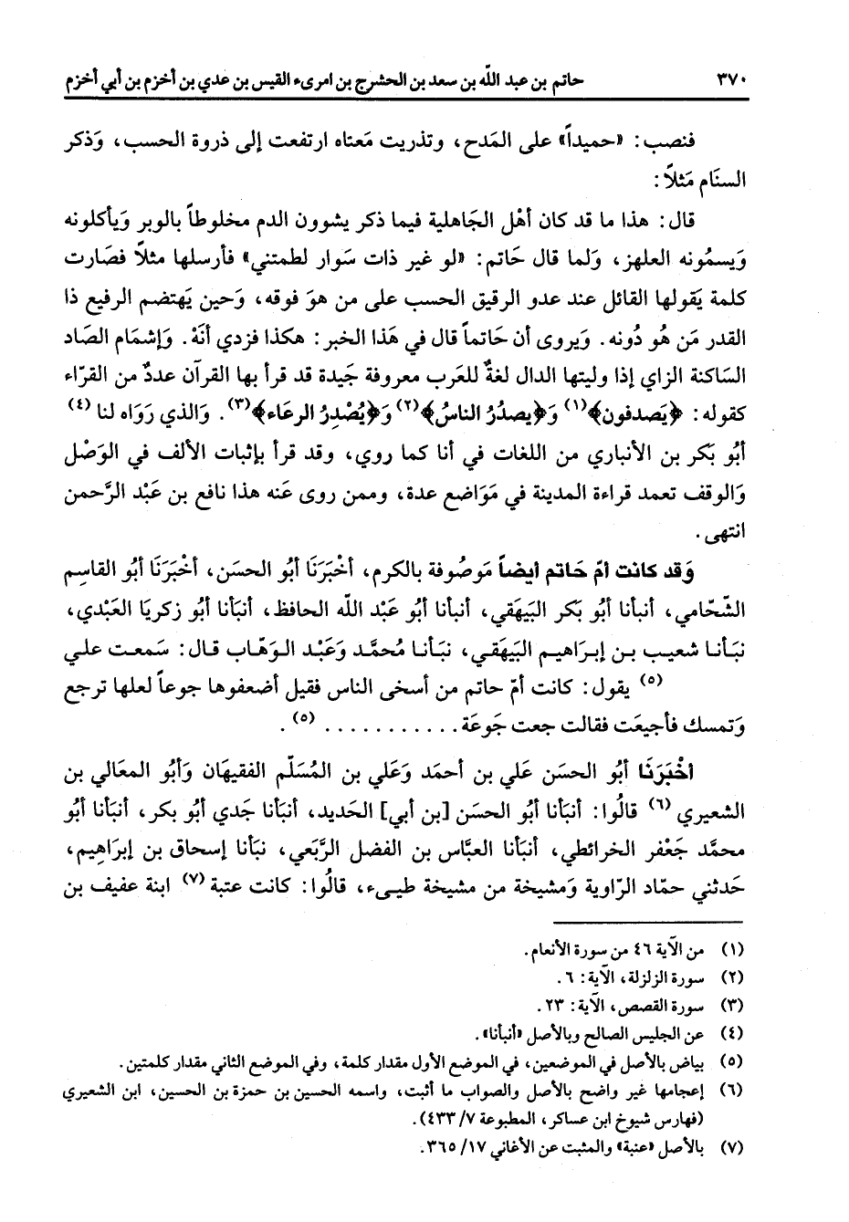 فنصب حميدا على المدح وتذريت معناه ارتفعت إلى ذروة الحسب وذكر السنام مثلا قال هذا ما قد كان أهل الجاهلية فيما ذكر يشوون الدم مخلوطا بالوبر ويأكلونه ويسمونه العلهز ولما قال حاتم لو غير ذات سوار لطمتني فأرسلها مثلا فصارت كلمة يقولها القائل عن عدو الرقيق الحسب على من هو فوقه وحين يهتضم الرفيع ذا القدر من هو دونه ويروي أن حاتما قال في هذا الخبر هكذا فزدي أنه وإشمام الصاد الساكنة الزاي إذا وليتها الدال لغة للعرب معروفة جيدة قد قرأ بها القرآن عدد من القراء كقوله " يصدفون " (1) و " يصدر الناس " (2) و " ويصدر الرعاء (3) " والذي رواه لنا (4) أبو بكر بن الأنباري من اللغات في أنا كما روي وقد قرأ بإثبات الألف في الوصل والوقف تعمد قراءة المدينة في مواضع عدة وممن روى عنه هذا نافع بن عبد الرحمن انتهى وقد كانت أم حاتم أيضا موصوفة بالكرم أخبرنا أبو الحسن أخبرنا أبو القاسم الشحامي أنبأنا أبو بكر البيهقي أنبأنا أبو عبد الله الحافظ أنبأنا أبو زكريا العبدي نبأنا شعيب بن إبراهيم البيهقي نبأنا محمد وعبد الوهاب قال سمعت علي (5) يقول كانت أم حاتم من أسخى الناس فقيل أضعفوها جوعا لعلها ترجع وتمسك فأجيعت فقالت جعت جوعة (5) أخبرنا أبو الحسن علي بن أحمد وعلي بن المسلم الفقيهان وأبو المعالي بن الشعيري (6) قالوا أنبأنا أبو الحسن بن أبي الحديد أنبأنا جدي أبو بكر أنبأنا أبو محمد جعفر الخرائطي أنبأنا العباس بن الفضل الربعي نبأنا إسحاق بن إبراهيم حدثني حماد الراوية ومشيخة من مشيخة طيئ قالوا كانت عتبة (7) ابنة عفيف بن