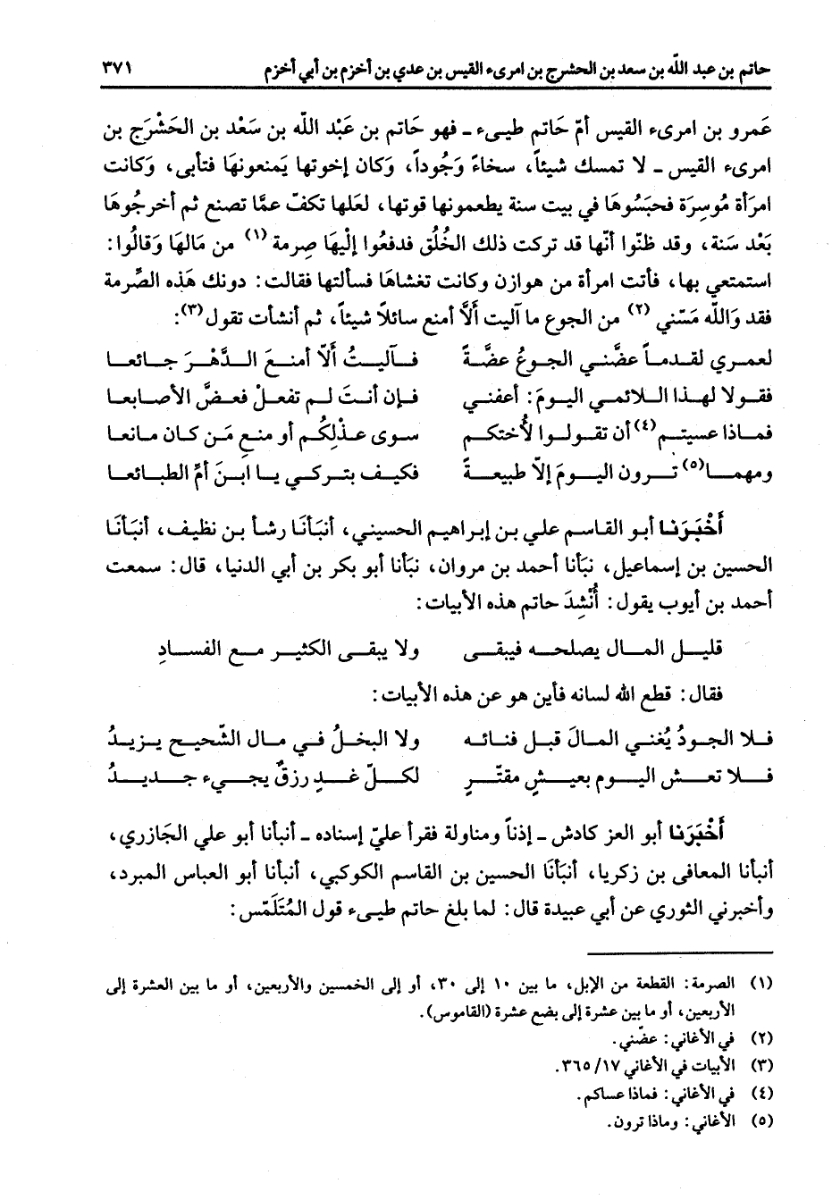 عمرو ابن امرئ القيس أم حاتم طيئ فهو حاتم بن عبد الله بن سعد بن الحشرج بن امرئ القيس لا تمسك شيئا سخاء وجودا وكان إخوتها يمنعونها فتأبى وكانت امرأة موسرة فحبسوها في بيت سنة يطعمونها قوتها لعلها تكف عما تصنع ثم أخرجوها بعد سنة وقد ظنوا أنها قد تركت ذلك الخلق فدفعوا إليها صرمة (1) من مالها وقالوا استمتعي بها فأتت امرأة من هوازن وكانت تغشاها فسألتها فقالت دونك هذه الصرمة فقد والله مسني (2) من الجوع ما آليت ألا أمنع سائلا شيئا ثم أنشأت تقول (3) لعمري لقدما عضنني الجوع عضة * فآليت ألا أمنع الدهر جائعا فقولا لهذا اللائمي اليوم أعفني * فإن أنت لم تفعل فعض الأصابعا فماذا عسيتم (4) أن تقولوا لأختكم * سوى عذلكم أو منع من كان مانعا * ومهما (5) ترون اليوم إلا طبيعة * فكيف بتركي يا ابن أم الطبائعا * أخبرنا أبو القاسم علي بن إبراهيم الحسيني أنبأنا رشأ بن نظيف أنبأنا الحسين إسماعيل نبأنا أحمد بن مروان نبأنا أبو بكر بن أبي الدنيا قال سمعت أحمد بن أيوب يقول أنشد حاتم هذه الأبيات قليل المال يصلحه فيبقى * ولا يبقى الكثير مع الفساد * فقال قطع الله لسانه فأين هو عن هذه الأبيات فلا الجود يغني المال قبل فنائه * ولا البخل في مال الشحيح يزيد فلا تعش اليوم بعيش مقتر * لكل غد رزق يجئ جديد * أخبرنا أبو العز كادش إذنا ومناولة فقرأ علي إسناده أنبأنا أبو علي الجازري أنبأنا المعافى بن زكريا أنبأنا الحسين بن القاسم الكواكبي أنبأنا أبو العباس المبرد وأخبرني الثوري عن أبي عبيدة قال لما بلغ حاتم طيئ قول المتلمس *