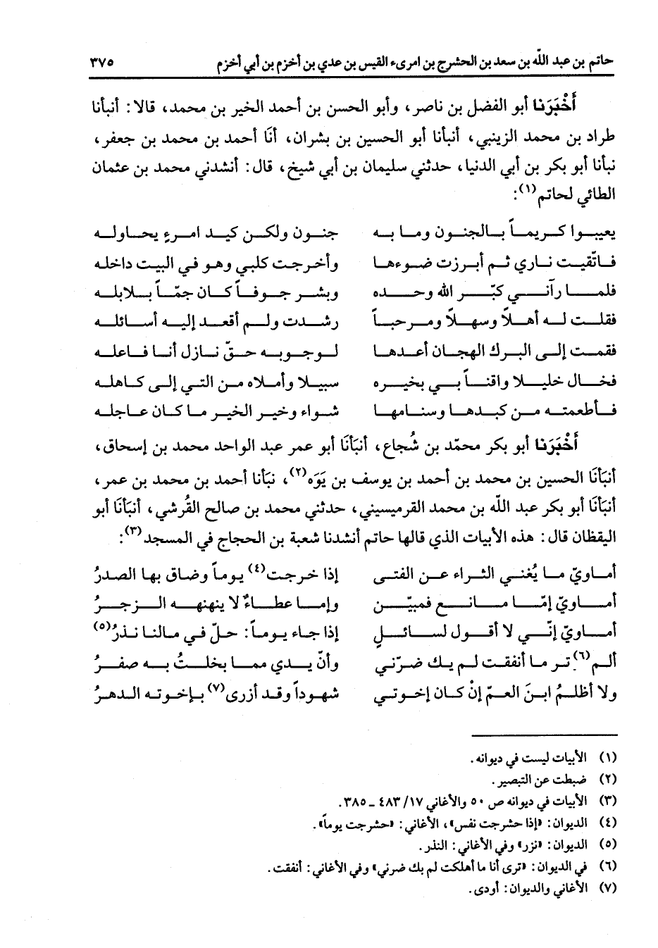 أخبرنا أبو الفضل بن ناصر وأبو الحسن بن أحمد الخير بن محمد قالا أنبأنا طراد بن محمد الزينبي أنبأنا أبو الحسين بن بشران أنا أحمد بن محمد بن جعفر نبأنا أبو بكر بن أبي الدنيا حدثني سليمان بن أبي شيخ قال أنشدني محمد بن عثمان الطائي لحاتم (1) يعيبوا كريما بالجنون وما به * جنون ولكن كيد امرء يحاوله فاتقيت ناري ثم أبرزت ضوءها * وأخرجت كلبي في البيت داخله فلما رآني كبر الله وحده * وبشر جوفا كان جما بلابله فقلت له أهلا وسهلا ومرحبا * رشدت ولم أقعد إليه أسائله فقمت إلى البرك الهجان أعدها * لوجوبه حق نازل أنا فاعله فخال خليلا واقنا بي بخيره * سبيلا وأملاه من التي إلى كاهله فأطعمته من كبدها وسنامها * شواء وخير الخير ما كان عاجله * أخبرنا أبو بكر محمد بن شجاع أنبأنا أبو عمر عبد الواحد محمد بن إسحاق أنبأنا الحسين بن محمد بن أحمد بن يوسف بن يوه (2) نبأنا أحمد بن محمد بن عمر أنبأنا أبو بكر عبد الله بن محمد القرميسيني حدثني محمد بن صالح القرشي أنبأنا أبو اليقظان قال هذه الأبيات الذي قالها حاتم أنشدنا شعبة بن الحجاج في المسجد (3) أماوي ما يغني الثراء عن الفتى * إذا خرجت (4) يوما وضاق بها الصدر اماوي إما مانع فمبين وإما عطاء لا ينهنهه الزجر أماوي إني لا أقول لسائل * إذا جاء يوما حل في مالنا نذر (5) ألم (6) تر ما أنفقت لم يك ضرني * وأن يدي مما بخلت به صفر ولا أظلم ابن العم إن كان إخوتي * شهودا وقد أزرى (7) بإخوته الدهر