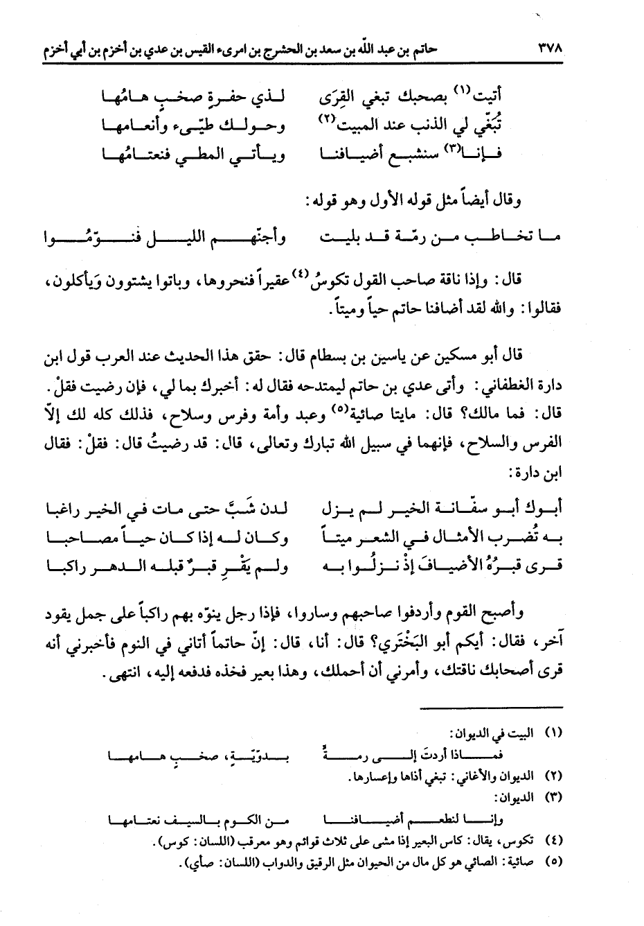 أتيت (1) بصحبك تبغي القرى * لذي حفرة صخب هامها تبغي لي الذنب عند المبيت (2) * وحولك طئ وأنعامها فإنا (3) سنشبع أضيافنا * ويأتي المطي فنعتامها * وقال أيضا مثل قوله الأول وهو قوله ما تخاطب من رمة قد بليت * وأجنهم الليل فنوموا * قال وإذا ناقة صاحب القول تكوس (4) عقيرا فنحروها وباتوا يشتوون ويأكلون فقالوا والله لقد أضافنا حاتم حيا وميتا قال أبو مسكين عن ياسين بن بسطام قال حقق هذا الحديث عند العرب قول ابن دارة الغطفاني وأتى عدي بن حاتم ليمتدحه فقال له أخبرك بما لي فإن رضيت فقل قال فما مالك قال مايتا صائية (5) وعبد وأمة وفرس وسلاح فذلك كله لك إلا الفرس والسلاح فإنهما في سبيل الله تبارك وتعالى قال قد رضيت قال فقل فقال ابن دارة أبوك أبو سفانة الخير لم يزل * لدن شب حتى مات في الخير راغبا به تضرب المثال في الشعر ميتا وكان له إذا كان حيا مصاحبا قرى قبره الأضياف إذ نزلوا به * ولم يقر قبر قبله الدهر راكبا * وأصبح القوم وأردفوا صاحبهم وساروا فإذا رجل ينوه بهم راكبا على جمل يقود آخر فقال أيكم أبو البختري قال أنا قال إن حاتما أتاني في النوم فأخبرني أنه قرى أصحابك ناقتك وأمرني أن أحملك وهذا بعير فخذه فدفعه إليه انتهى