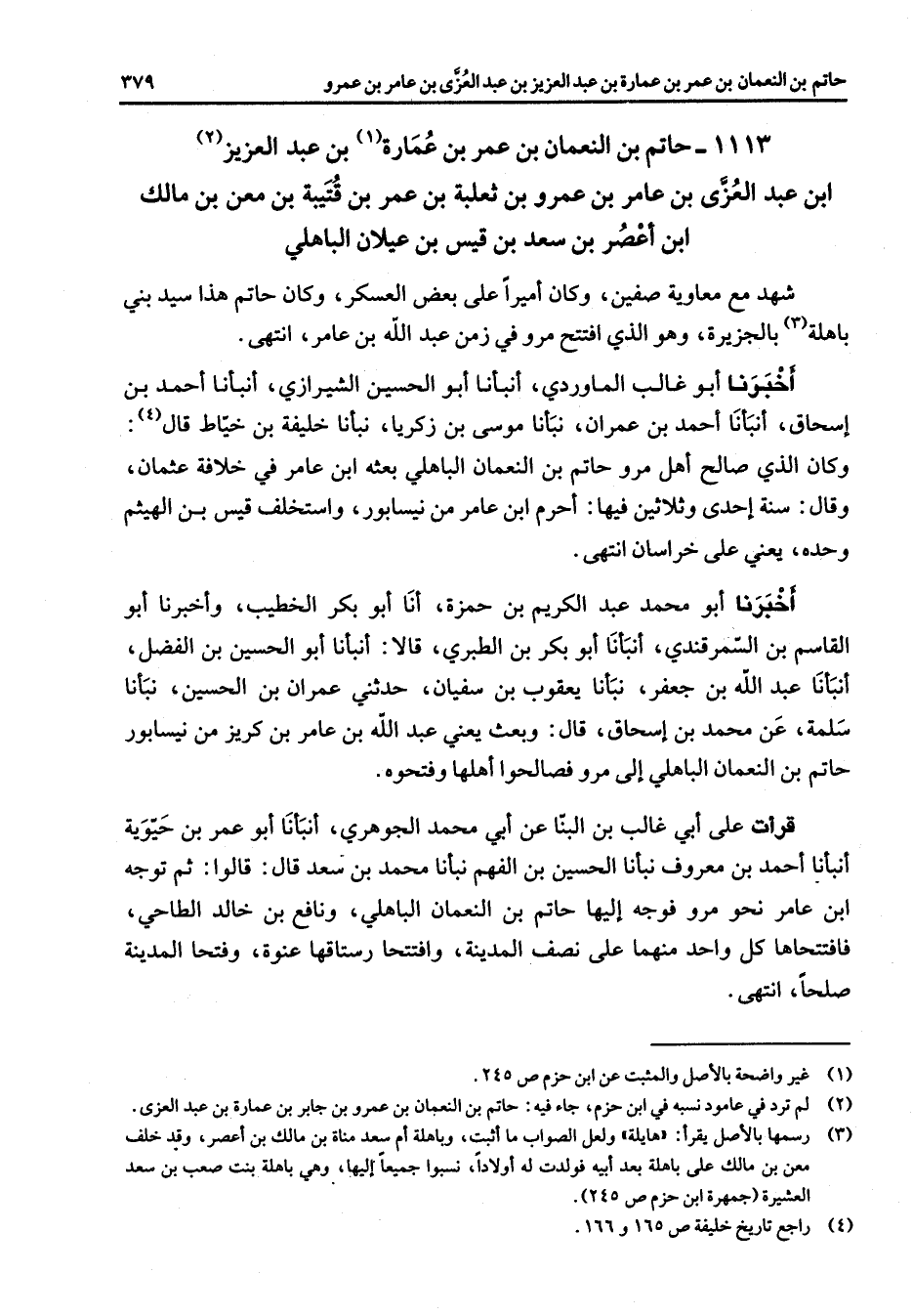 1113 - حاتم بن النعمان بن عمر بن عمارة (1) بن عبد العزيز (2) ابن عبد العزى بن عامر بن عمرو بن ثعلبة بن عمر بن قتيبة بن معن بن مالك ابن أعصر بن سعد بن قيس بن عيلان الباهلي شهد مع معاوية صفين وكان أميرا على بعض العسكر وكان حاتم هذا سيد بني باهلة (1) بالجزيرة وهو الذي افتتح مرو في زمن عبد الله بن عامر انتهى أخبرنا أبو غالب الماوردي أنبأنا أبو الحسين الشيرازي أنبأنا أحمد بن