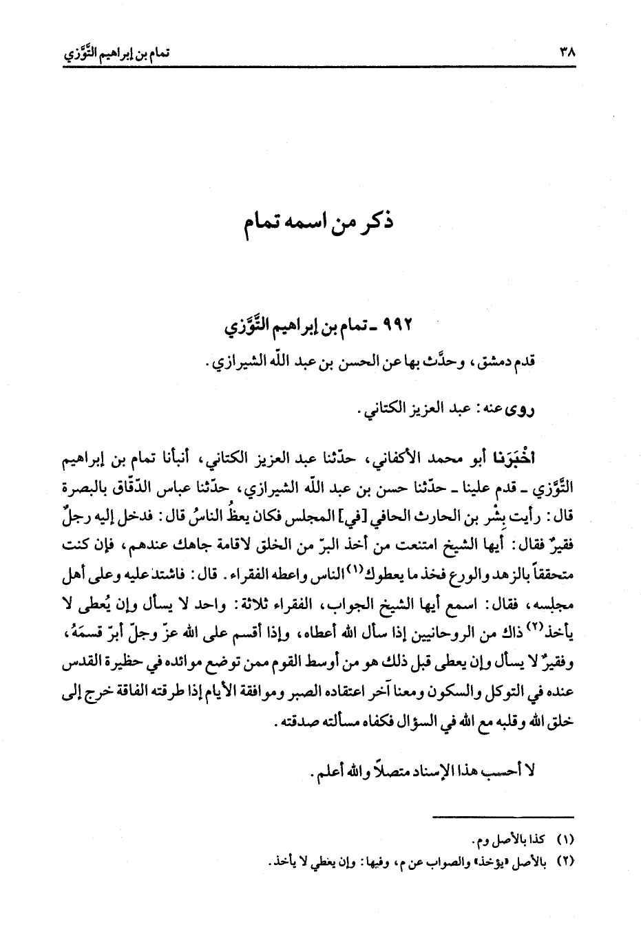 992 - تمام بن إبراهيم التوزي قدم دمشق وحدث بها عن الحسن بن عبد الله الشيرازي روى عنه عبد العزيز الكتاني أخبرنا أبو محمد الأكفاني حدثنا عبد العزيز الكتاني أنبأنا تمام بن إبراهيم التوزي قدم علينا حدثنا حسن بن عبد الله الشيرازي حدثنا عباس الدقاق بالبصرة قال رأيت بشر بن الحارث الحافي في المجلس فكان يعظ الناس قال فدخل إليه رجل فقير فقال أيها الشيخ امتنعت من أخذ البر من الخلق لاقامة جاهك عندهم فإن كنت متحققا بالزهد والورع فخذ ما يعطوك (1) الناس واعطه الفقراء قال فاشتد عليه وعلى أهل مجلسه فقال اسمع أيها الشيخ الجواب الفقراء ثلاثة واحد لا يسأل وإن يعطى لا يأخذ (2) ذاك من الروحانيين إذا سأل الله أعطاه وإذا أقسم على الله عز وجل أبر قسمه وفقير لا يسأل وإن يعطى قبل ذلك هو من أوسط القوم ممن توضع موائده في حظيرة القدس عنده في التوكل والسكون ومعنا آخر اعتقاده الصبر وموافقة الأيام إذا طرقته الفاقة خرج إلى خلق الله وقلبه مع الله في السؤال فكفاه مسألته صدقته لا أحسب هذا الإسناد متصلا والله أعلم