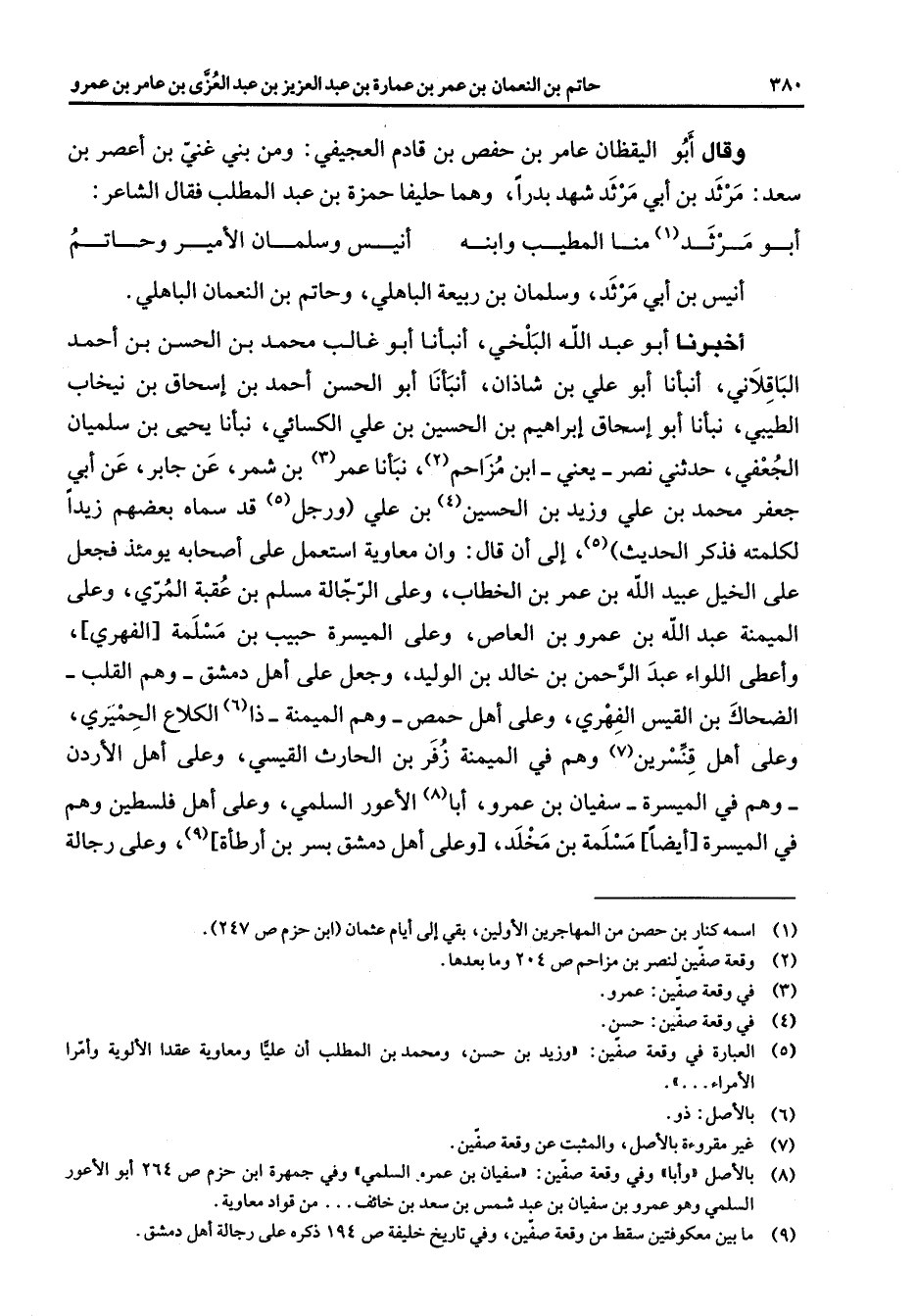 وقال أبو اليقظان عامر بن حفص بن قادم العجيفي ومن بني غني بن أعصر بن سعد مرثد بن أبي مرثد شهد بدرا وهما حليفا حمزة بن عبد المطلب فقال الشاعر أبو مرثد (1) منا المطيب وابنه أنيس وسلمان الأمير وحاتم * أنيس بن أبي مرثد وسلمان بن ربيعة الباهلي وحاتم بن النعمان الباهلي أخبرنا أبو عبد الله البلخي أنبأنا أبو غالب محمد بن الحسن بن أحمد الباقلاني أنبأنا أبو علي بن شاذان أنبأنا أبو الحسن أحمد بن إسحاق بن نيخاب الطيبي نبأنا أبو إسحاق إبراهيم بن الحسين بن علي الكسائي نبأنا يحيى بن سلميان الجعفي حدثني نصر يعني ابن مزاحم (2) نبأنا عمر (3) بن شمر عن جابر عن أبي جعفر محمد بن علي وزيد بن الحسين (4) بن علي ورجل قد سماه بعضهم زيدا لكلمته فذكر الحديث (5) إلى أن قال وأن معاوية استعمل على أصحابه يومئذ فجعل على الخيل عبيد الله بن عمر بن الخطاب وعلى الرجالة مسلم بن عقبة المري وعلى الميمنة عبد الله بن عمرو بن العاص وعلى الميسرة حبيب بن مسلمة الفهري وأعطى اللواء عبد الرحمن بن خالد بن الوليد وجعل على أهل دمشق وهم القلب الضحاك بن القيس الفهري وعلى أهل حمص وهم الميمنة ذا (6) الكلاع الحميري وعلى أهل قنسرين (7) وهم في الميمنة زفر بن الحارث القيسي وعلى أهل الأردن وهم في الميسرة سفيان بن عمرو أبا الأعور السلمي وعلى أهل فلسطين وهم في الميسرة أيضا مسلمة بن مخلد وعلى أهل دمشق بسر بن أرطأة (9) وعلى رجالة