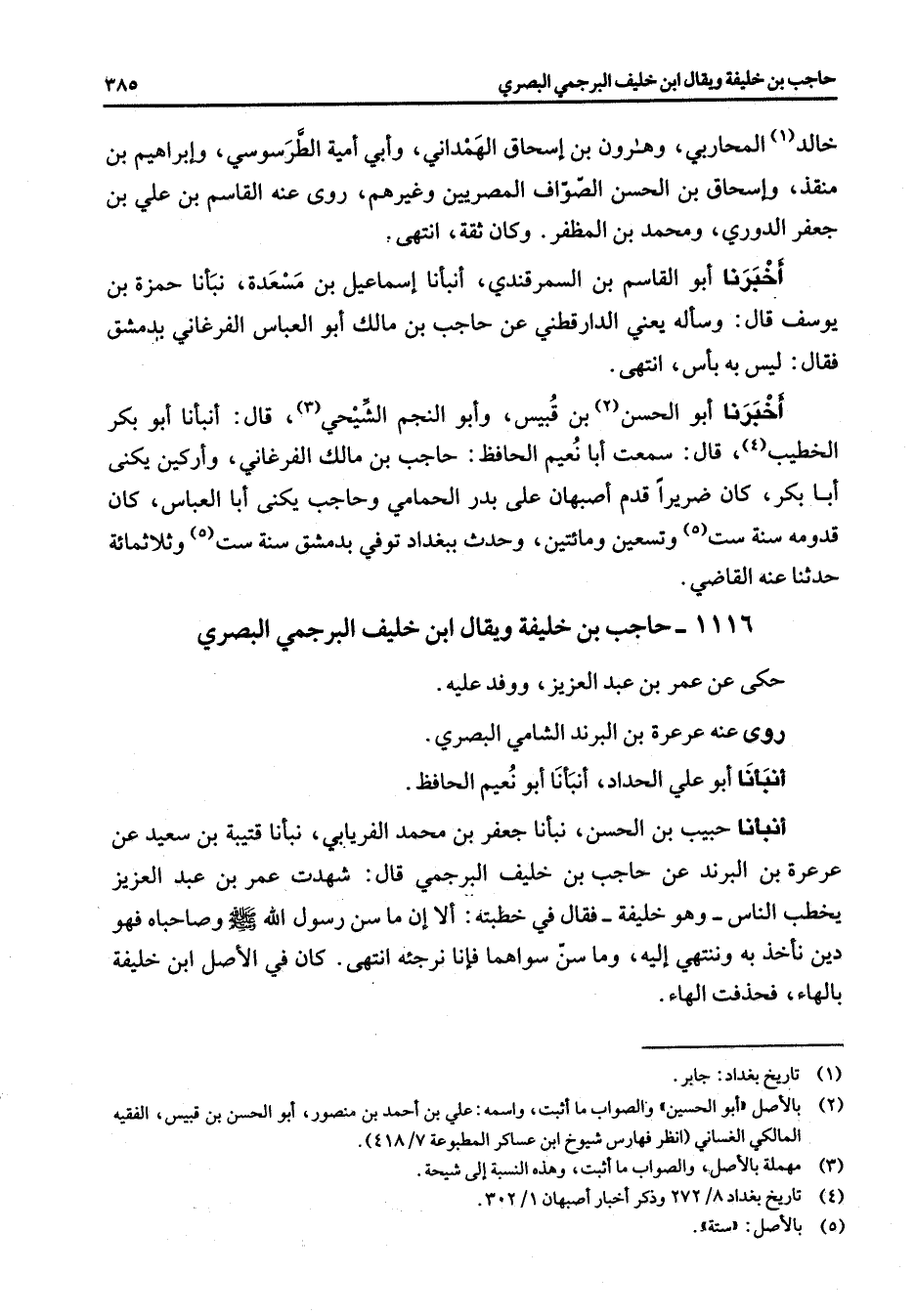 1116 - حاجب بن خليفة ويقال ابن خليف البرجمي البصري حكى عن عمر بن عبد العزيز ووفد عليه روى عنه عرعرة بن البرند الشامي البصري أنبأنا أبو علي الحداد أنبأنا أبو نعيم الحافظ أنبأنا حبيب بن الحسن نبأنا جعفر بن محمد الفريابي نبأنا قتيبة بن سعيد عن عرعرة بن البرند عن حاجب بن خليف البرجمي قال شهدت عمر بن عبد العزيز يخطب الناس وهو خليفة فقال في خطبته إلا إن ما سن رسول الله (صلى الله عليه وسلم) وصاحباه فهو دين نأخذ به وننتهي إليه وما سن سواهما فإنا نرجئه انتهى كان في الأصل ابن خليفة بالهاء فحذفت الهاء