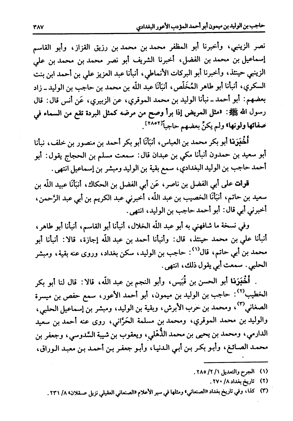 [2852] ح أخبرنا أبو بكر محمد بن العباس أنبأنا أبو بكر أحمد بن منصور بن خلف نبأنا أبو سعيد بن حمدون أنبأنا مكي بن عبدان قال سمعت مسلم بن الحجاج يقول أبو أحمد حاجب بن الوليد البغدادي سمع بقية بن الوليد ومبشر بن إسماعيل انتهى قرأت على أبي الفضل بن ناصر عن أبي الفضل بن الحكاك أنبأنا عبيد الله بن سعيد بن حاتم وأنبأنا الخصيب بن عبد الله أخبرني عبد الكريم بن أبي عبد الرحمن أخبرني أبي قال أبو أحمد حاجب بن الوليد انتهى وفي نسخة ما شافهني به أبو عبد الله الخلال أنبأنا أبو القاسم أنبأنا أبو طاهر أنبأنا علي بن محمد حينئذ قال أنبأنا أحمد بن عبد الله إجازة قالا أنبأنا أبو محمد بن أبي حاتم قال (1) حاجب بن الوليد سكن بغداد وروى عنه بقية ومبشر الحلبي سمعت أبي يقول ذلك أنتهى أخبرنا أبو الحسن بن قبيس وأبو النجم بن عبد الله قالا قال لنا أبو بكر الخطيب (2) حاجب بن الوليد بن ميمون أبو أحمد الأعور سمع حفص بن ميسرة الصغاني (3) ومحمد بن حرب الأبرش وبقية بن الوليد ومبشر بن إسماعيل الحلبي والوليد بن محمد الموقري ومحمد بن مسلمة الحراني روى عنه أحمد بن سعيد الدارمي ومحمد بن يحيى بن محمد الذهلي ويعقوب بن شيبة السدوسي وجعفر بن محمد الصائغ وأبو بكر بن أبي الدنيا وأبو جعفر بن أحمد بن معبد الوراق