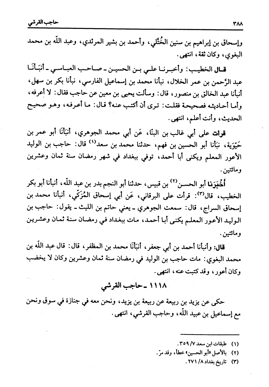 1118 - حاجب القرشي حكى عن يزيد بن ربيعة عن ربيعة بن يزيد ونحن معه في جنازة في سوق ونحن مع إسماعيل بن عبيد الله وحاجب القرشي انتهى "