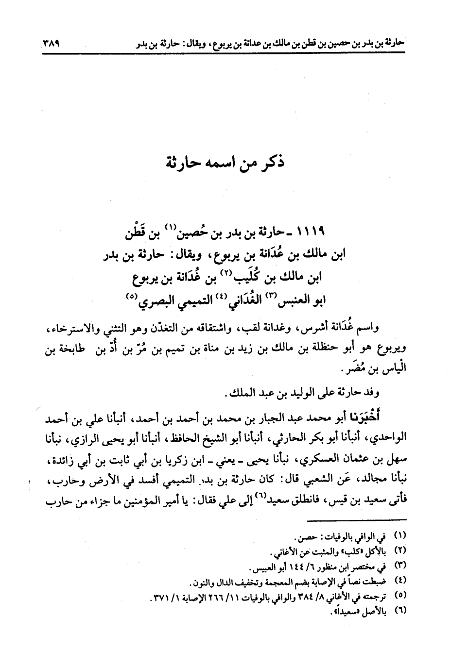 1119 - حارثة بن بدر بن حصين (1) بن قطن ابن مالك بن عدانة بن يربوع ويقال حارثة بن بدر ابن مالك بن كليب (2) بن غدانة بن يربوع أبو العنبس (3) الغداني (4) التميمي البصري (5) وأسم غدانة أشرس وغدانة لقب ولإشتقاقه من التغدن وهو التثني والإسترخاء ويربوع هو أبو حنظلة بن مالك بن زيد بن مناة بن تميم بن مر بن أد بن طابخة بن الياس بن مضر وفد حارثة على الوليد بن عبد الملك أخبرنا أبو محمد عبد الجبار بن محمد بن أحمد بن أحمد أنبأنا علي بن أحمد الواحدي أنبأنا أبو بكر الحارثي أنبأنا أبو الشيخ الحافظ أنبأنا أبو يحيى الرازي نبأنا سهل بن عثمان العسكري نبأنا يحيى يعني ابن زكريا بن أبي ثابت بن أبي زائدة نبأنا مجالد عن الشعبي قال كان حارثة بن بدر التميمي أفسد في الأرض وحارب فأتى سعيد بن قيس فانطلق سعيد (6) إلى علي فقال يا أمير المؤمنين ما جزاء من حارب