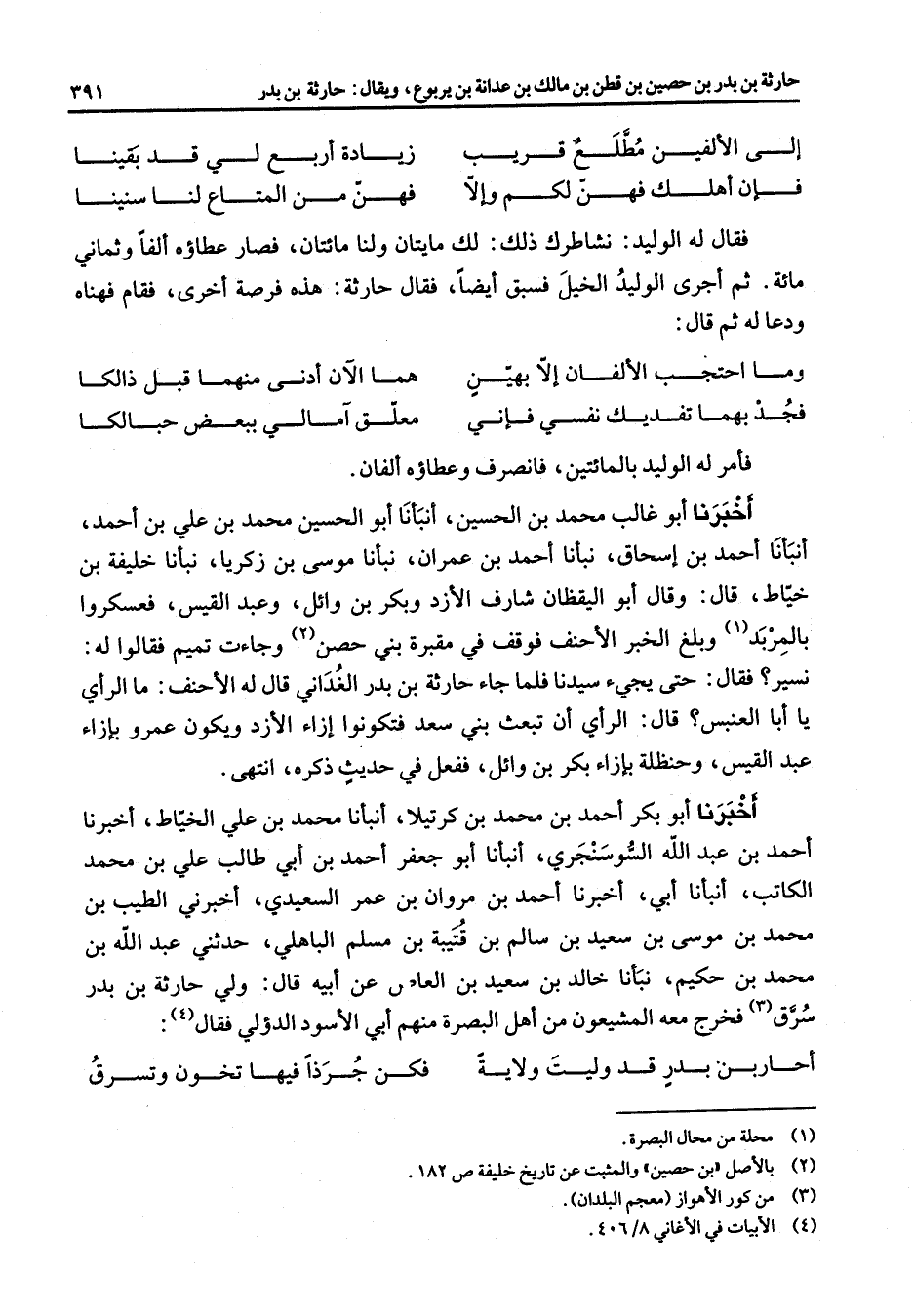 إلى الألفين مطلع قريب * زيادة أربع لي قد بقينا فإن أهلك فهن لكم وإلا * فهن من المتاع لنا سنينا * فقال له الوليد نشاطرك ذلك لك مايتان ولنا مائتان فصار عطاؤه ألفا وثماني مائة ثم أجرى الوليد الخيل فسبق أيضا فقال حارثة هذه فرصة أخرى فقام فهناه ودعا له ثم قال وما احتجب الألفان إلا بهين * هما الآن أدنى منهما قبل ذالكا فجد بهما تفديك نفسي فإني * معلق آمالي ببعض حبالكا * فأمر له الوليد بالمائتين فانصرف وعطاؤه ألفان أخبرنا أبو غالب محمد بن الحسين أنبأنا أبو الحسين محمد بن علي بن أحمد أنبأنا أحمد بن إسحاق نبأنا أحمد بن عمران نبأنا موسى بن زكريا نبأنا خليفة بن خياط قال وقال أبو اليقظان شارف الأزد وبكر بن وائل وعبد القيس فعسكروا بالمربد (1) وبلغ الخبر الأحنف فوقف في مقبرة بني حصن (2) وجاءت تميم فقالوا له نسير فقال حتى يجئ سيدنا فلما جاء حارثة بن بدر الغداني قال له الأحنف ما الرأي يا أبا العنبس قال الرأي أن تبعث بني سعد فتكونا إزاء الأزد ويكون عمرو بإزاء عبد القيس وحنظلة بإزاء بكر بن وائل ففعل في حديث ذكره انتهى أخبرنا أبو بكر أحمد بن محمد بن كرتيلا أنبأنا محمد بن علي الخياط أخبرنا أحمد بن عبد الله السوسنجري أنبأنا أبو جعفر أحمد بن أبي طالب علي بن محمد الكاتب أنبأنا أبي أخبرنا أحمد بن مروان بن عمر السعيدي أخبرني الطيب بن محمد بن موسى بن سعيد بن سالم بن قتيبة بن مسلم الباهلي حدثني عبد الله بن محمد بن حكيم نبأنا خالد بن سعيد بن العاص عن أبيه قال ولي حارثة بن بدر سرق (3) فخرج معه المشيعون من أهل البصرة منهم أبي الأسود الدؤلي فقال * (4) * أحاربن بدر قد وليت ولاية * فكن جرذا فيها تخون وتسرق