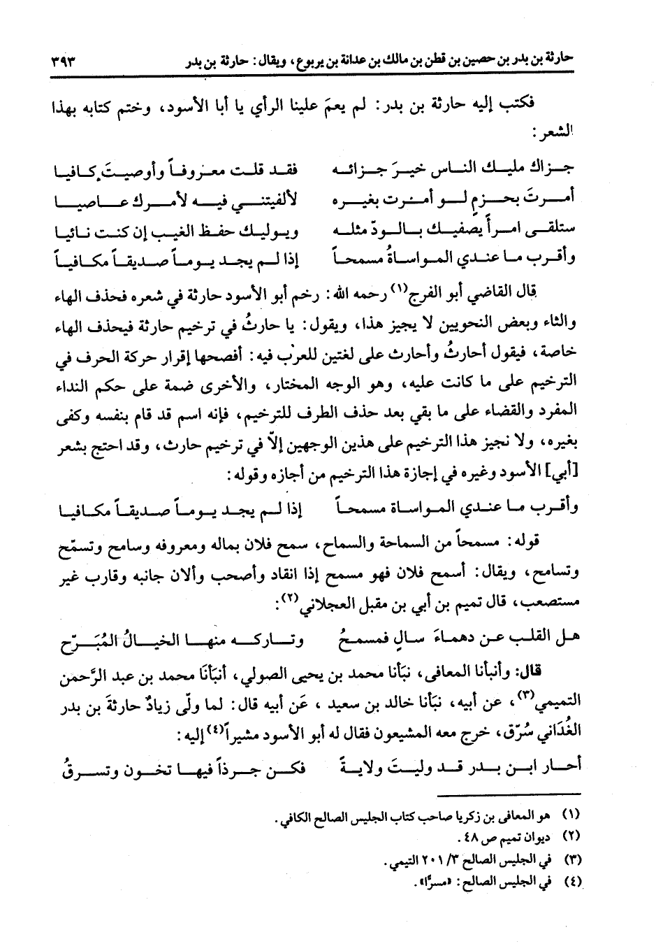 فكتب إليه حارثة بن بدر لم يعم علينا الرأي يا أبا الأسود وختم كتابه بهذا الشعر جزاك مليك الناس خير جزائه * فقد قلت معروفا وأوصيت كافيا أمرت بحزم لو أمرت بغيره * لألفيتني فيه لأمرك عاصيا ستلقى أمرا يصفيك بالود مثله * ويوليك حفظ الغيب إن كنت نائيا وأقرب ما عندي المواساة مسمحا * إذا لم يجد يوما صديقا مكافيا * وقال القاضي أبو الفرج (1) رحمة الله رخم أبو الأسود حارثة في شعره فحذف الهاء والثاء وبعض النحويين لا يجيز هذا ويقول يا حارث في ترخيم حارثة فيحذف الهاء خاصه فيقول أحارث وأحارث على لغتين للعرب فيه أفصحها إقرار حركة الحرف في الترخيم على ما كانت عليه وهو الوجه المختار والأخرى ضمة على حكم النداء المفرد والقضاء على ما بقي بعد حذف الطرف للترخيم فإنه اسم قد قام بنفسه وكفى بغيره ولا نجيز هذا الترخيم على هذين الوجهين إلا في ترخيم حارث وقد احتج بشعر أبي الأسود وغيره في إجازة هذا الترخيم من أجازه وقوله وأقرب ما عندي المواساة مسمحا * إذا لم يجد يوما صديقا مكافيا * قوله مسمحا من السماحة والسماح سمح فلان بماله ومعروفه وسامح وتسمح وتسامح ويقال أسمح فلان فهو مسمح إذا انقاد وأصحب وألان جانبه وقارب غير مستصعب قال تميم بن أبي بن مقبل العجلاني (2) هل القلب عن دهماء سال فمسمح * وتاركه منها الخيال المبرح * قال وأنبأنا المعافى نبأنا محمد بن يحيى الصولي أنبأنا محمد بن عبد الرحمن التميمي (3) عن أبيه نبأنا خالد بن سعيد عن أبيه قال لما ولى زياد حارثة بن بدر الغداني سرق خرج معه المشيعون فقال له أبو الأسود مشيرا (4) إليه أحار ابن بدر قد وليت ولاية * فكن جرذا فيها تخون وتسرق