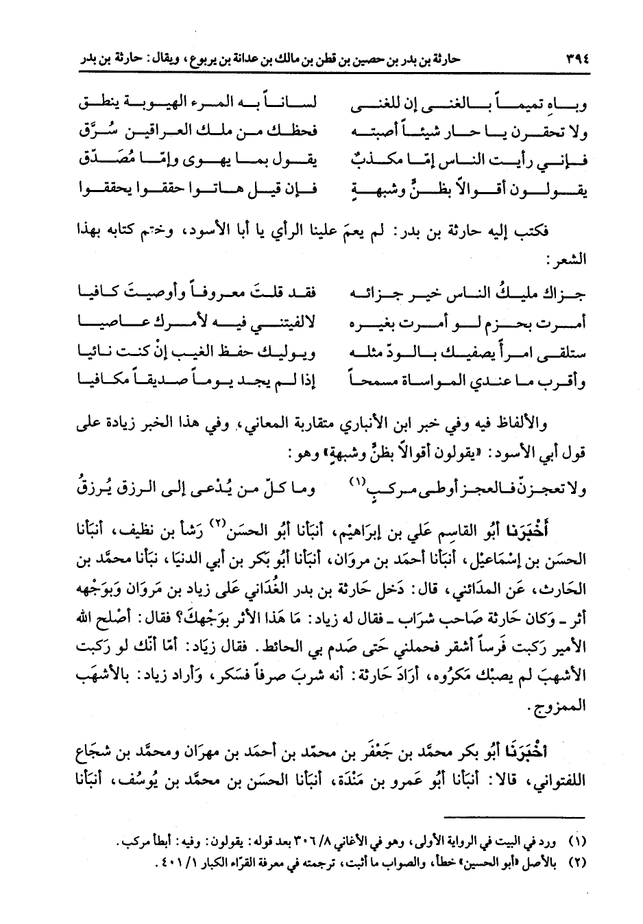 وباه تميما بالغنى إن للغنى * لسانا به المرء الهيوبة ينطق ولا تحقرن يا حار شيئا أصبته * فحظك من ملك العراقين سرق فإني رأيت الناس إما مكذب * يقول بما يهوى وإما مصدق يقولون أقوالا بظن وشبهة * فإن قيل هاتوا حققوا يحققوا * فكتب إليه حارثة بن بدر لم يعم علينا الرأي يا أبا الأسود وختم كتابه بهذا الشعر جزاك مليك الناس خير جزائه * فقد قلت معروفا وأوصيت كافيا أمرت بحزم لو أمرت بغيره * لالفيتني فيه لأمرك عاصيا ستلقى أمرأ يصفيك بالود مثله * ويوليك حفظ الغيب إنك كنت يائيا وأقرب ما عندي المواساة مسمحا * إذا لم يجد يوما صديقا مكافيا * والألفاظ فيه وفي خبر ابن الأنباري متقاربة المعاني وفي هذا الخبر زيادة على قول أبي الأسود يقولون أقوالا بظن وشبهة وهو ولا تعجزن فالعجز أوطى مركب (1) * وما كل من يدعى إلى الرزق يرزق * أخبرنا أبو القاسم علي بن إبراهيم أنبأنا أبو الحسن (2) رشأ بن نظيف أنبأنا الحسن بن إسماعيل أنبأنا أحمد بن مروان أنبأنا أبو بكر بن أبي الدنيا نبأنا محمد بن الحارث عن المدائني قال دخل حارثة بن بدر الغداني على زياد بن مروان وبوجهه أثر وكان حارثة صاحب شراب فقال له زياد ما هذا الأثر بوجهك فقال أصلح الله الأمير ركبت فرسا أشقر فحملني حتى صدم بي الحائط فقال زياد أما أنك لو ركبت الأشهب لم يصبك مكروه أراد حارثة أنه شرب صرفا فسكر وأراد زياد بالأشهب الممزوج أخبرنا أبو بكر محمد بن جعفر بن محمد بن أحمد بن مهران ومحمد بن شجاع اللفتواني قالا أنبأنا أبو عمرو بن مندة أنبأنا الحسن بن محمد بن يوسف أنبأنا