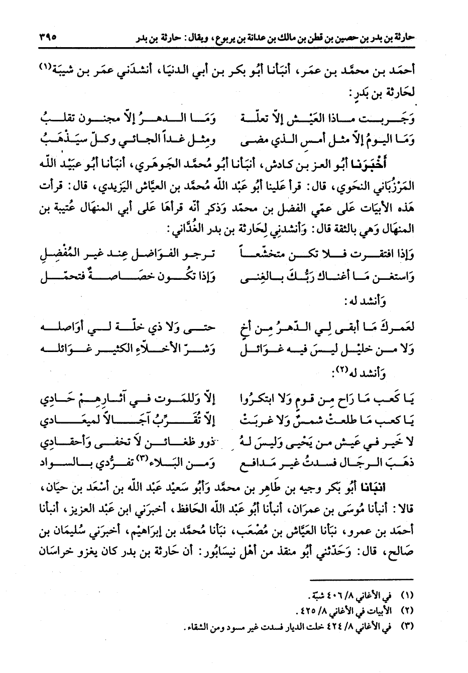 أحمد بن محمد بن عمر أنبأنا أبو بكر بن أبي الدنيا أنشدني عمر بن شيبة (1) لحارثة بن بدر وجربت ماذا العيش إلا تعلة * وما الدهر إلا مجنون تقلب وما اليوم إلا مثل أمس الذي مضى * ومثل غدا الجائي وكل سيذهب * أخبرنا أبو العز من كادش أنبأنا أبو محمد الجوهري أنبأنا أبو عبيد الله المرزباني النحوي قال قرأ علينا أبو عبد الله محمد بن العياش اليزيدي قال قرأت هذه الأبيات على عمي الفضل بن محمد وذكر أنه قرأها على أبي المنهال عتيبة بن المنهال وهي بالثقة قال وأنشدني لحارثة بن بدر الغداني وإذا افتقرت فلا تكن متخشعا * ترجو الفواضل عند غير المفضل واستغن ما أغناك ربك بالغنى * وإذا تكون خصاصة فتحمل * وأنشد له لعمرك ما أبقى لي الدهر من أخ * حتى ولا ذي خلة لي أواصله ولا من خليل ليس فيه غوائل * وشر الأخلاء الكثير غوائله * وأنشد له (2) يا كعب ما راح من قوم ولا ابتكروا * إلا وللموت في آثارهم حادي يا كعب ما طلعت شمس ولا غربت * إلا تقرب آجالا لميعادي لا خير في عيش من يحيى وليس له * ذوو ظغائن لا تخفى وأحقادي ذهب الرجال فسدت غير مدافع * ومن البلاء (3) تفردي بالسواد * أنبأنا أبو بكر وجيه بن طاهر بن محمد وأبو سعيد عبد الله بن اسعد بن حيان قالا أنبأنا موسى بن عمران أنبأنا أبو عبد الله الحافظ أخبرني ابن عبد العزيز أنبأنا احمد بن عمرو نبأنا العياش بن مصعب نبأنا محمد بن إبراهيم أخبرني سليمان بن صالح قال وحدثني أبو منقذ من أهل نيسابور أن حارثة بن بدر كان يغزو خراسان