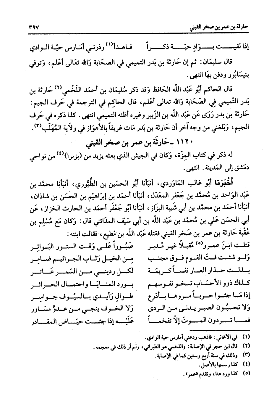1120 - حارثة بن عمر ين صخر القيني له ذكر في كتاب المزة وكان في الجيش الذي بعث يزيد من بزبرا (4) من نواحي دمشق غلى المدينة انتهى أخبرنا أبو غالب الماوردي أنبأنا أبو الحسين بن الطيور ي أنبأنا محمد بن عبد الواحد بن محمد بن جعفر المعدل أنبأنا أحمد بن إبراهيم بن الحسن بن شاذان أنبأنا أحمد بن محمد بن أبي شيبة البزاز أنبأنا أبو جعفر أحمد بن الحارث الخزاز عن أبي الحسن علي بن محمد بن عبد الله بن أبي سيف المدائني قال وكان مع مسلم بن عقبة حارثة بن عمر بن صخر القني فقتله عبد الله بن مطيع فقالت ابنته قتلت ابن عمرو (5) مقبلا غير مدبر * صبورا على وقت الستور البواتر ولو شئت فت القوم فوق مجنب * من الخيل وثاب الجراثيم ضامر بذلت حذار العار نفسا كريمة * لكل رديني من السمر عاتر كذاك ذوو الأحساب تسخو نفوسهم * بورد المنايا واحتمال الحرائر إذا ما جثوا حربا مروها بأذرع * طوال وأيدي بالسيوف جواسر ولا تحسبون الصبر يدنى من الردى * ولا الخوف ينجي من عدو مساور فما تردون الموت إلا تفخما * عليه إذا جئت حياض المقادر *