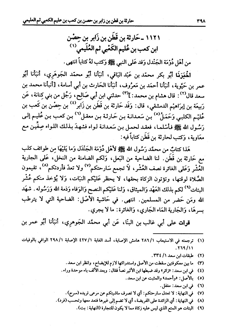 1121 - حارثة بن قطن بن زابر بن حصن ابن كعب بن عليم الكعبي ثم العليمي (1) من أهل دومة الجندل وفد على النبي (صلى الله عليه وسلم) وكتب له كتابا انتهى أخبرنا أبو بكر محمد بن عبد الباقي أنبأنا أبو محمد الجوهري أنبأنا أبو عمر بن حيوية أنبأنا أحمد بن معروف أنبأنا الحارث بن أبي أسامة أنبأنا محمد بن سعد قال قال (2) هشام بن محمد (3) حدثني ابن أبي صالح رجل من بني كنانة عن ربيعة بن إبراهيم الدمشقي قال وفد حارثة بن قطن بن زابر (4) بن حصن بن كعب عليم الكلبي (5) وحمل بن سعدانة بن حارثة بن معقل (6) بن كعب بن عليم إلى رسول الله (صلى الله عليه وسلم) فأسلما فعقد لحمل بن سعدانة لواء فشهد بذلك اللواء صفين مع معاوية وكتب لحارثة بن قطن كتابا فيه هذا كتاب من محمد رسول الله (صلى الله عليه وسلم) لأهل دومة الجندل وما يليها من طوائف كلب مع حارثة بن قطن لنا الضاحية من البعل ولكم الضامنة من النخل على الجارية العشر وعلى الغائرة نصف العشر لا تجمع سارحتكم (7) ولا تعد فأردتكم (8) تقيمون الصلاة لوقتها وتؤتون الزكاة بحقها لا يحظر عليكم النبات ولا يؤخذ منكم عشر البتات (9) لكم بذلك العهد والميثاق ولنا عليكم النصح والوفاء وذمة الله ورسوله شهد الله ومن حضر من المسلمين انتهى في حاشية الأصل الضاحية التي لا يترطب بسرها والجارية الماء الجاري والغائرة ما لا يجري قرأت على أبي غالب بن البنا عن أبي محمد الجوهري أنبأنا أبو عمر بن