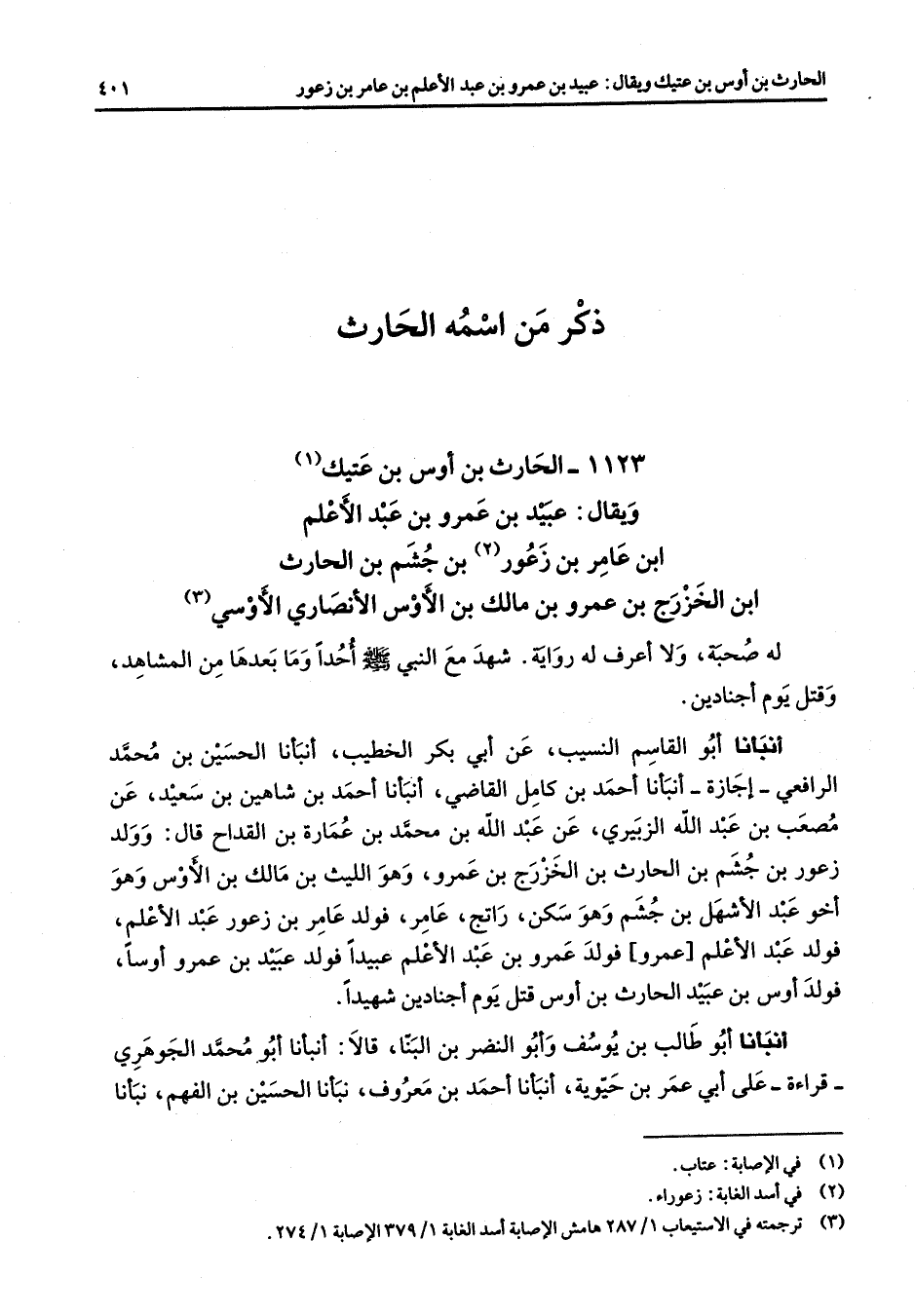 1123 - الحارث بن أوس بن عتيك (1) ويقال عبيد بن عمرو بن عبد الأعلم ابن عامر بن زعور (2) بن جشم بن الحارث ابن الخزرج بن عمرو بن مالك بن الأوس الأنصاري الأوسي (3) له صحبة ولا أعرف له رواية شهد مع النبي (صلى الله عليه وسلم) أحدا وما بعدها من المشاهد وقتل يوم أجنادين أنبأنا أبو القاسم النسيب عن أبي بكر الخطيب أنبأنا الحسين بن محمد الرافعي إجازة أنبأنا أحمد بن كامل القاضي أنبأنا أحمد بن شاهين بن سعيد عن مصعب بن عبد الله الزبيري عن عبد الله بن محمد بن عمارة بن القداح قال وولد زعور بن جشم بن الحارث بن الخزرج بن عمرو وهو الليث بم مالك بن الأوس وهو أخو عبد الأشهل بن جشم وهو سكن راتج عامر فولد عامر بن زعور عبد الأعلم فولد عبد الأعلم عمرو فولد عمرو بن عبد الأعلم عبيد فولد عبيدا بن عمرو أوسا فولد أوس بن عبيد الحارث بن أوس قتل يوم أجنادين شهيدا أنبأنا أبو طالب بن يوسف وأبو النضر بن البنا قالا أنبأنا أبو محمد الجوهري قراءة على أبي عمر بن حيوية أنبأنا أحمد بن معروف نبأنا الحسين بن الفهم نبأنا