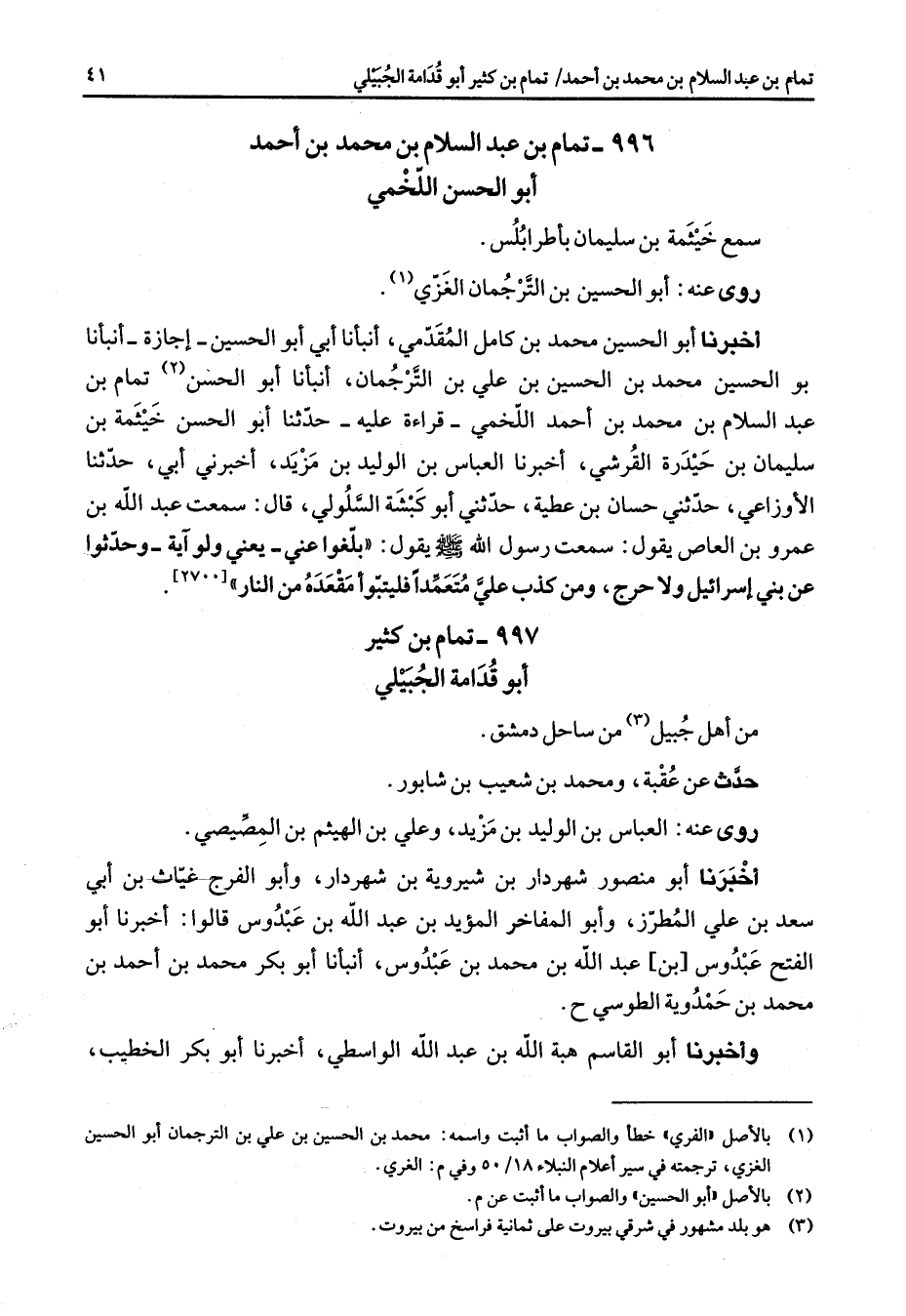 996 - تمام بن عبد السلام بن محمد بن أحمد أبو الحسن اللخمي سمع خيثمة بن سليمان بأطرابلس روى عنه أبو الحسين بن الترجمان الغزي (1) أخبرنا أبو الحسين محمد بن كامل المقدمي أنبأنا أبي أبو الحسين إجازة أنبأنا أبو الحسين محمد بن الحسين بن علي بن الترجمان أنبأنا أبو الحسن (2) تمام بن عبد السلام بن محمد بن أحمد اللخمي قراءة عليه حدثنا أبو الحسن خيثمة بن سليمان بن حيدرة القرشي أخبرنا العباس بن الوليد بن مزيد أخبرني أبي حدثنا الأوزاعي حدثني حسان بن عطية حدثني أبو كبشة السلولي قال سمعت عبد الله بن عمرو بن العاص يقول سمعت رسول الله (صلى الله عليه وسلم) يقول بلغوا عني يعني ولو آية وحدثوا عن بني إسرائيل ولا حرج ومن كذب علي متعمدا فليتبوأ مقعده من النار