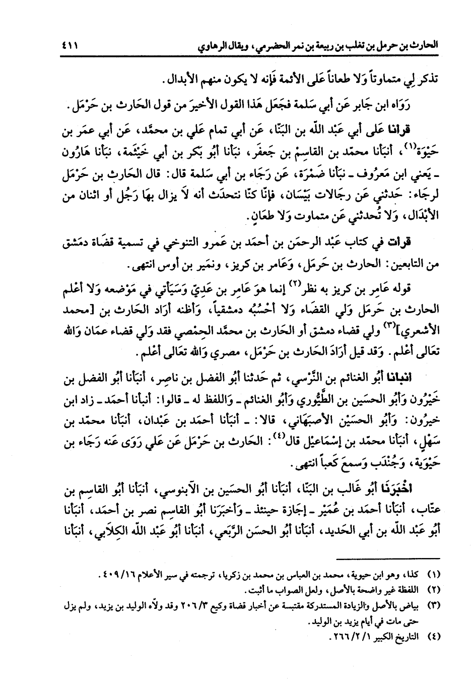 تذكر لي متماوتا ولا طعانا على الأئمة فإنه لا يكون منهم الأبدال رواه ابن جابر عن أبي سلمة فجعل هذا القول الأخير من قول الحارث بن حرمل قرأنا على أبي عبد الله بن البنا عن أبي تمام علي بن محمد عن أبي عمر بن حيوة (1) أنبأنا محمد بن القاسم بن جعفر نبأنا أبو بكر بن أبي خيثمة نبأنا هارون يعني ابن معروف نبأنا ضمرة عن رجاء بن أبي سلمة قال قال الحارث بن حرمل لرجاء حدثني عن رجالات بيسان فإنا كنا نتحدث أنه لا يزال بها رجل أو اثنان من الأبدال ولا تحدثني عن متماوت ولا طعان قرأت في كتاب عبد الرحمن بن احمد بن عمرو التنوخي في تسمية قضاة دمشق من التابعين الحارث بن حرمل وعامر بن كريز ونمير بن أوس انتهى قوله عامر بن كريز به نظر (2) إنما هو عامر بن عدي وسيأتي في موضعه ولا أعلم الحارث بن حرمل ولي القضاء ولا أحسبه دمشقيا وأظنه أراد الحارث بن محمد الأشعري (3) ولي قضاء دمشق أو الحارث بن محمد الحمصي فقد ولي قضاء عمان والله تعالى أعلم وقد قيل أراد الحارث بن حرمل مصري والله تعالى أعلم أنبأنا أبو الغنائم بن النرسي ثم حدثنا أبو الفضل بن ناصر أنبأنا أبو الفضل بن خيرون وأبو الحسين بن الطيوري وأبو الغنائم واللفظ له قالوا أنبأنا أحمد زاد ابن خيرون وأبو الحسين الأصبهاني قالا أنبأنا أحمد بن عبدان أنبأنا محمد بن سهل أنبأنا محمد بن إسماعيل قال (4) الحارث بن حرمل عن علي روى عنه رجاء بن حيوية وجندب وسمع كعبا انتهى أخبرنا أبو غالب بن البنا أنبأنا أبو الحسين بن الآبنوسي أنبأنا أبو القاسم بن عتاب أنبأنا أحمد بن عمير إجازة حينئذ وأخبرنا أبو القاسم نصر بن أحمد أنبأنا أبو عبد الله بن أبي الحديد أنبأنا أبو الحسن الربعي أنبأنا أبو عبد الله الكلابي أنبأنا