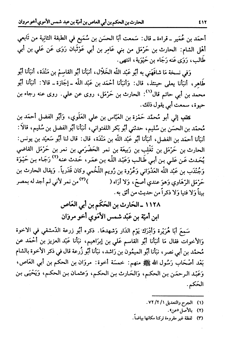 1128 - الحارث بن الحكم بن أبي العاص ابن أمية بن عبد شمس الأموي أخو مروان سمع أبا هريرة وأدرك يوم الدار وشهدها ذكره أبو زرعة الدمشقي في الاخوة والأخوات فقال ما أنبانا أبو القاسم علي بن إبراهيم نبأنا عبد العزيز بن أحمد عن محمد بن أبي نصر نبأنا أبو الميمون بن راشد نبأنا أبو زرعة قال في ذكر الاخوة بالشام بعد أصحاب رسول الله (صلى الله عليه وسلم) منهم خمسة أخوة مروان بن الحكم بن أبي العاص وعبد الرحمن بن الحكم والحارث بن الحكم وعثمان بن الحكم ويحيى بن الحكم