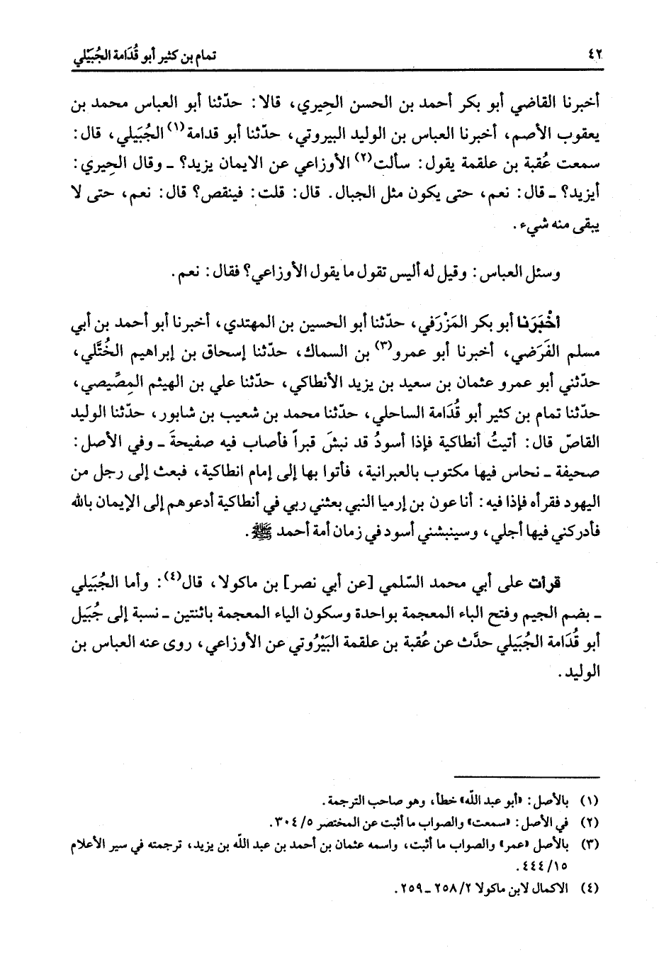 أخبرنا القاضي أبو بكر أحمد بن الحسن الحيري قالا حدثنا أبو العباس محمد بن يعقوب الأصم أخبرنا العباس بن الوليد البيروتي حدثنا أبو قدامة (1) الجبيلي قال سمعت عقبة بن علقمة يقول سألت (2) الأوزاعي عن الإيمان يزيد وقال الحيري أيزيد قال نعم حتى يكون مثل الجبال قال قلت فينقص قال نعم حتى لا يبقى منه شئ وسئل العباس وقيل له أليس تقول ما يقول الأوزاعي فقال نعم أخبرنا أبو بكر المزرفي حدثنا أبو الحسين بن المهتدي أخبرنا أبو أحمد بن أبي مسلم القرضي أخبرنا أبو عمرو (3) بن السماك حدثنا إسحاق بن إبراهيم الختلي حدثني أبو عمرو عثمان بن سعيد بن يزيد الأنطاكي حدثنا علي بن الهيثم المصيصي حدثنا تمام بن كثير أبو قدامة الساحلي حدثنا محمد بن شعيب بن شابور حدثنا الوليد القاص قال أتيت أنطاكية فإذا أسود قد نبش قبرا فأصاب فيه صفيحة وفي الأصل صحيفة نحاس فيها مكتوب بالعبرانية فأتوا بها إلى إمام أنطاكية فبعث إلى رجل من اليهود فقرأه فإذا فيه أنا عون بن إرميا النبي بعثني ربي في أنطاكية أدعوهم إلى الإيمان بالله فأدركني فيها أجلي وسينبشني أسود في زمان أمة أحمد (صلى الله عليه وسلم) قرأت على أبي محمد السلمي عن أبي نصر بن ماكولا قال وأما (4) الجبيلي بضم الجيم وفتح الباء المعجمة بواحدة وسكون الياء المعجمة باثنتين نسبة إلى جبيل أبو قدامة الجبيلي حدث عن عقبة بن علقمة البيروتي عن الأوزاعي روى عنه العباس بن الوليد
