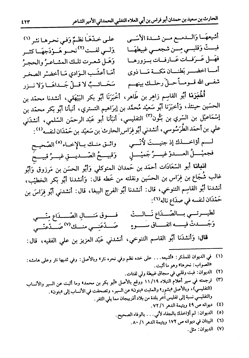 أشيعها والدمع من شدة الأسى * على خدها نظم وفي نحرها نثر (1) فبت وقلبي من شجعي غبيطها * ولي لفت (2) نحو هودجها كثر * فهل عرفات عارفات بزورها * وهل شعرت تلك المشاعر والحجر أما اخضر بطنان مكة ما ذوى * أما أعشب الوادي ما أخضر الصخر شفى الله قوما حل رحلك بينهم * سحائب لا قل جداها ولا نزر * أخبرنا أبو القاسم زاهر بن طاهر أخبرنا أبو بكر البيهقي أنشدنا محمد بن الحسين حينئذ وأخبرنا أبو سعيد محمد بن إبراهيم التستري أنبأنا أبو بكر محمد بن إسماعيل بن السري بن بنون (3) التفليسي أنبأنا أبو عبد الرحمن السلمي أنشدني علي بن أحمد الطرسوسي أنشدني أبو فراس الحارث بن سعيد بن حمدان لنفسه (4) لم أؤاخذك إذ جنيت لأني * واثق منك بالإخاء الصحيح فجميل العدو غير جميل * وقبيح الصديق غير قبيح * أنبأنا أبو السعادات أحمد بن حمدان المتوكلي وأبو الحسن بن مرزوق وأبو غالب شجاع بن فراس بن الحسين ونقلته من خطه قال وأنشدنا أبو بكر الخطيب أنشدنا أبو القاسم التنوخي قال أنشدنا أبو الفرج الببغا قال أنشدني أبو فراس بن حمدان لنفسه في صداع ناله (6) لطيرتي بالصداع نالت * فوق منال الصداع مني وجدت فيه اتفاق سوء * صدعني منك (7) صدعني * قال وأنشدنا أبو القاسم التنوخي أنشدني عبد العزيز بن علي الفقيه قال