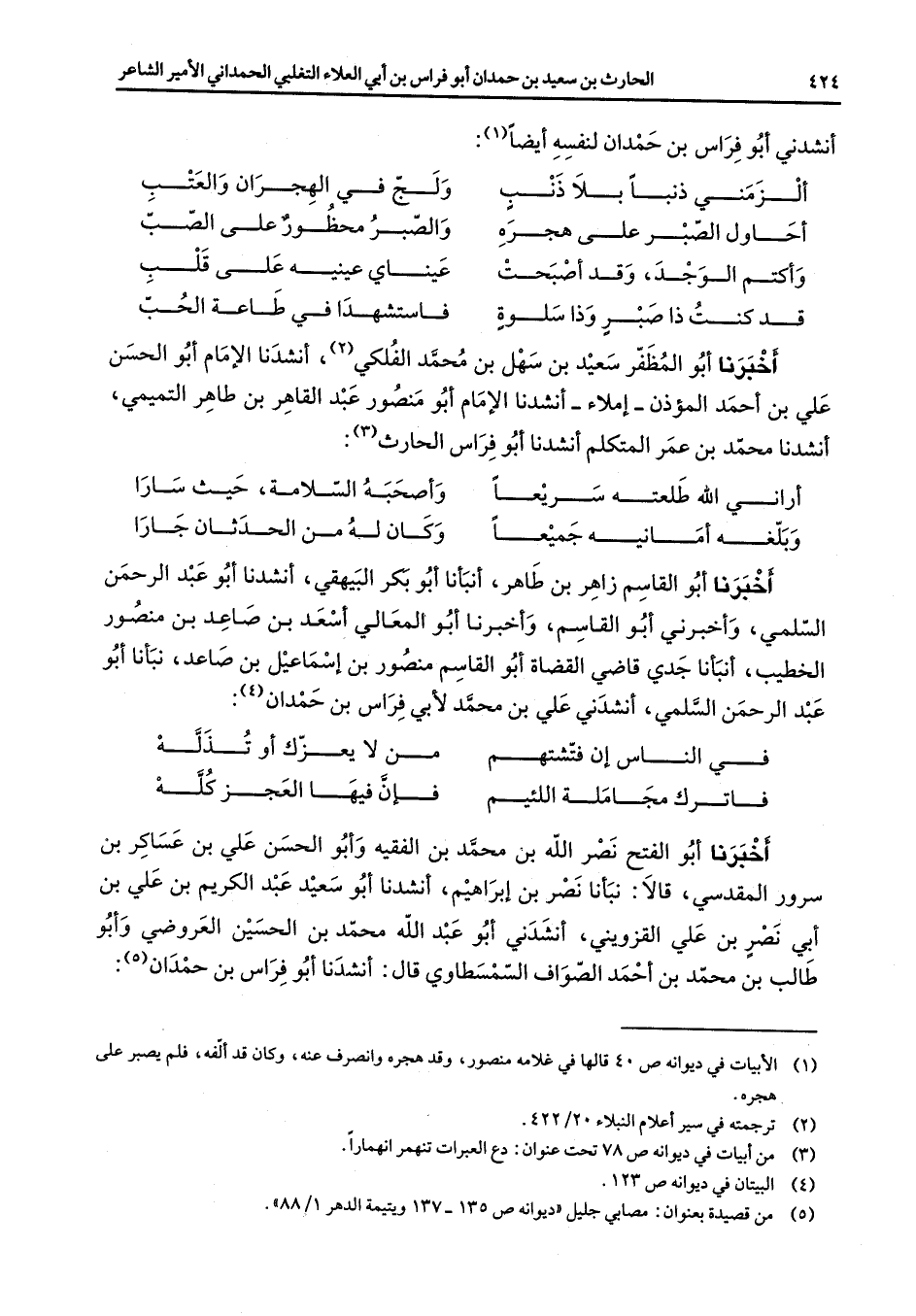 أنشدني أبو فراس بن حمدان لنفسه ايضا (1) ألزمني ذنبا بلا ذنب * ولج في الهجران والعتب أحاول الصبر على هجرة * والصبر محظور على الصب وأكتم الوجد وقد أصبحت * عيناي عينيه على قلب قد كنت ذا صبر وذا سلوة * فاستشهدا في طاعة الحب * أخبرنا أبو المظفر سعيد بن سهل بن محمد الفلكي (2) أنشدنا الإمام أبو الحسن علي بن احمد المؤذن إملاء أنشدنا الإمام أبو منصور عبد القاهر بن طاهر التميمي أنشدنا محمد بن عمر المتكلم أنشدنا أبو فراس الحارث (3) أراني الله طلعته سريعا * وأصحبه السلامة حيث سارا وبلغه أمانيه جميعا * وكان له من الحدثان جارا * أخبرنا أبو القاسم زاهر بن طاهر أنبأنا أبو بكر البيهقي أنشدنا أبو عبد الرحمن السلمي وأخبرني أبو القاسم وأخبرنا أبو المعالي اسعد بن صاعد بن منصور الخطيب أنبأنا جدي قاضي القضاة أبو القاسم منصور بن إسماعيل بن صاعد نبأنا أبو عبد الرحمن السلمي أنشدني علي بن محمد لأبي فراس بن حمدان (4) في الناس إن فتشتهم * من لا يعزك أو تذله فاترك مجاملة اللئيم * فإن فيها العجز كله * أخبرنا أبو الفتح نصر الله بن محمد بن الفقيه وأبو الحسن علي بن عساكر بن سرور المقدسي قالا نبأنا نصر بن إبراهيم أنشدنا أبو سعيد عبد الكريم بن علي بن أبي نصر بن علي القزويني أنشدني أبو عبد الله محمد بن الحسين العروضي وأبو طالب بن محمد بن أحمد الصواف السمسطاوي قال أنشدنا أبو فراس بن حمدان (5)