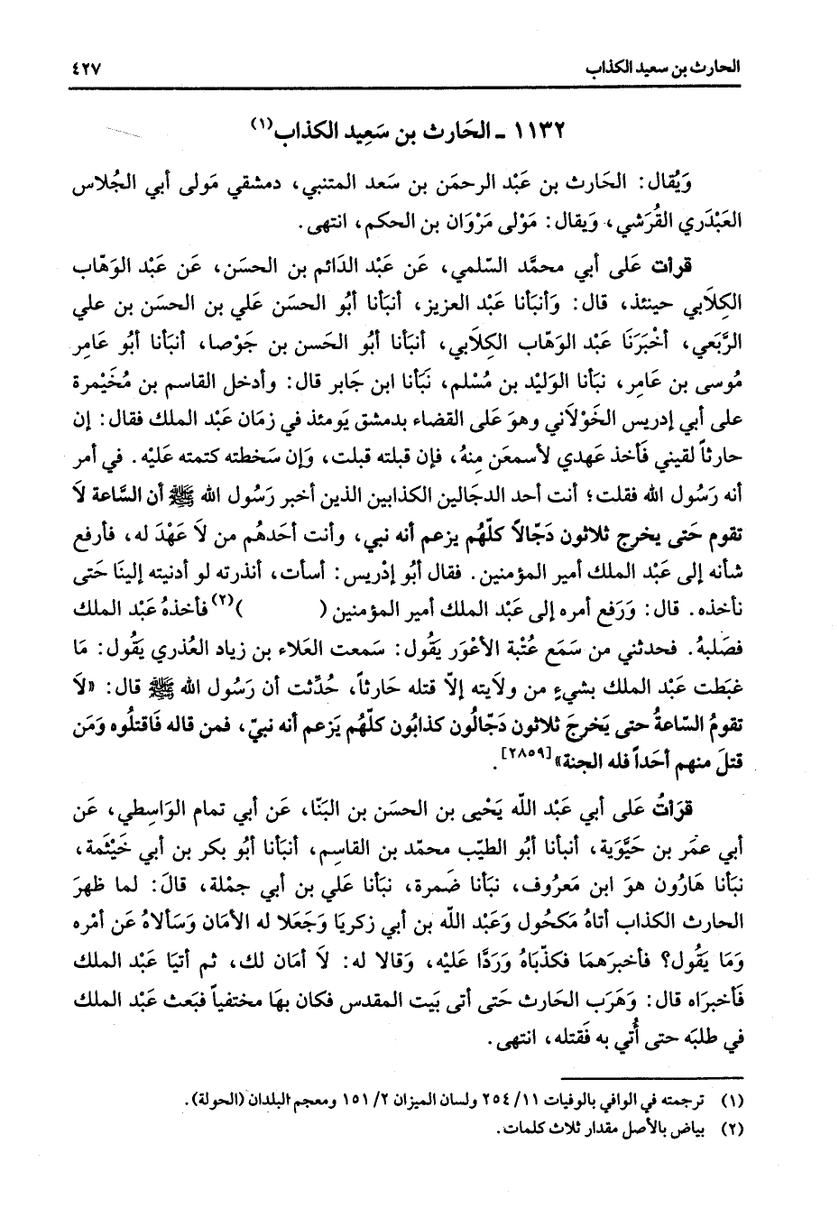 1132 - الحارث بن سعيد الكذاب (1) ويقال الحارث بن عبد الرحمن بن سعد المتنبي دمشقي مولى أبي الجلا س العبدري القرشي ويقال مولى مروان بن الحكم انتهى قرأت على أبي محمد السلمي عن عبد الدائم بن الحسن عن عبد الوهاب الكلابي حينئذ قال وأنبأنا عبد العزيز أنبأنا أبو الحسن علي بن الحسن بن علي الربعي أخبرنا عبد الوهاب الكلابي أنبأنا أبو الحسن بن جوصا أنبأنا أبو عامر موسى بن عامر نبأنا الوليد بن مسلم نبأنا ابن جابر قال وأدخل القاسم بن مخيمرة على أبي إدريس الخلواني وهو على القضاء بدمشق يومئذ في زمان عبد الملك فقال إن حارثا لقيني فأخذ عهدي لأسمعن منه فإن قبلته قبلت وإن سخطته كتمته عليه في أمر أنه رسول الله فقلت أنت أحمد الدجالين الكذابين الذين أخبر رسول الله (صلى الله عليه وسلم) أن الساعة لا تقوم حتى يخرج ثلاثون دجالا كلهم يزعم أنه نبي وأنت أحدهم من لا عهد له فأرفع شأنه إلى عبد الملك أمير المؤمنين فقال أبو إدريس أسأت أنذرته لو أدنيته إلينا حتى نأخذه قال ورفع أمره إلى عبد الملك أمير المؤمنين (2) فأخذه عبد الملك فصلبه فحدثني من سمع عتبة الأعور يقول سمعت العلاء بن زياد العذري يقول ما غبطت عبد الملك بشئ من ولايته إلا قتله حارثا حدثت أن رسول الله (صلى الله عليه وسلم) قال لا تقوم الساعة حتى يخرج ثلاثون دجالون كذابون كلهم يزعم أنه نبي فمن قاله فاقتلوه ومن قتل منهم أحدا فله الجنة