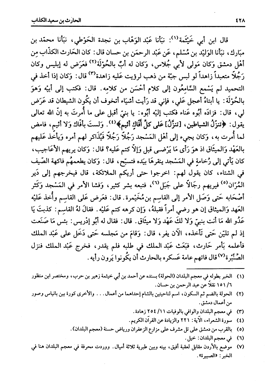 قال ابن أبي خيثمة (1) نبأنا عبدا لوهاب بن نجدة الحوطي نبأنا محمد بن مبارك نبأنا الوليد بن مسلم عن عبد الرحمن بن حسان قال كان الحارث الكذاب من أهل دمشق وكان مولى لأبي جلاس وكان له أب بالحولة فعرض له إبليس وكان رجلا متعبدا زاهدا لو لبس جبة من ذهب لرؤيت عليه زاهدة (3) قال وكان إذا أخذ في التحميد لم يسمع السامعون إلى كلام أحسن من كلامه قال فكتب إلى أبيه وهو بالحولة يا أبتاه أعجل علي فإني قد رأيت أشياء أتخوف أن يكون الشيطان قد عرض لي قال فزاده أبوه عناء فكتب إليه أبوه يا بني أقبل على ما أمرت به إن الله تعالى يقول " تنزل الشياطين تنزل على كل أفاك أثيم (4) " ولست بأفاك ولا أثيم فامض لما أمرت به وكان يجئ إلى أهل المسجد رجلا رجلا فيذاكر لهم أمره ويأخذ عليهم بالعهد والميثاق أذ هو رأى ما يرضى قبل وإلا كتم عليه قال وكان يريهم الأعاجيب كان يأتي إلى رخامة في المسجد ينقرها بيده فتسبح قال وكان يطعمهم فاكهة الصيف في الشتاء كان يقول لهم أخرجوا حتى أريكم الملائكة قال فيخرجهم إلى دير المران (5) فيريهم رجالا على جبل (6) فتبعه بشر كثير وفشا الأمر في المسجد وكثر أصحابه حتى وصل الأمر إلى القاسم بن مخيمرة قال فعرض على القاسم وأخذ عليه العهد والميثاق إن هو رضي أمرا فقبله وإن كرهه كتم عليه فقال له القاسم كذبت يا عدو الله ما أنت بنبي ولا لك عهد ولا ميثاق قال فقال له أبو إدريس بئس ما صنعت إذ لم تلين حتى تأخذه الآن يفر قال وقام من مجلسه حتى دخل على عبد الملك فأعلمه بأمر حارث فبعث عبد الملك في طلبه فلم يقدر فخرج عبد الملك فنزل الصنبرة (7) قال فاتهم عامة عسكره بالحارث أن يكونوا يرون رأيه