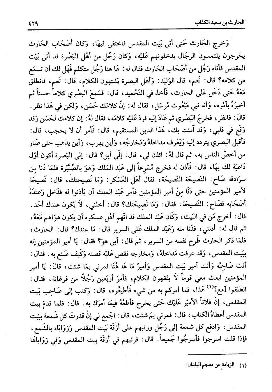 وخرج الحارث حتى أتى بيت المقدس فاختفى فيها وكان أصحاب الحارث يخرجون يلتمسون الرجال يدخلونهم عليه وكان رجل من أهل البصرة قد أتى بيت المقدس فأتاه رجل من أصحاب الحارث فقال له ها هنا رجل متكلم فهل لك أن تسمع من كلامه قال نعم قال الوليد وأهل البصرة يشتهون الكلام قال نعم فانطلق معه حتى دخل على الحارث فأخذ في التحميد قال فسمع البصري كلاما حسنا ثم أخبره بأمره وأنه نبي مبعوث مرسل فقال له إن كلامك حسن ولكن في هذا نظر قال فانظر فخرج البصري ثم عاد إليه فرد عليه كلامه فقال له إن كلامك لحسن وقد وقع في قلبي وقد آمنت بك هذا الدين المستقيم قال فأمر أن لا يحجب قال فأقبل البصري يتردد إليه ويعرف مداخله ومخارجه وأين يهرب وأين يذهب حتى صار من أخص الناس به ثم قال له ائذن لي قال إلى أين قال إلى البصرة أكون اول داعية لك بها قال فأذن له فخرج مسرعا إلى عبد الملك وهو بالصنبرة فلما دنا من سرادقة صاح النصيحة النصيحة فقال أهل العسكر وما نصيحتك قال نصيحة لأمير المؤمنين حتى دنا من أمير المؤمنين فأمر عبد الملك أن يأذنوا له فدخل وعنده أصحابه فصاح النصيحة فقال وما نصيحتك قال أخلني لا يكون عندك أحد قال أخرج من في البيت وكان عبد الملك قد اتهم أهل عسكره أن يكون هواهم معه ثم قال له أدنني فدنا منه وعبد الملك على السرير قال ما عندك قال الحارث فلما ذكر الحارث طرح نفسه من السرير ثم قال أين هو فقال يا أمير المؤمنين إنه ببيت المقدس وقد عرفت مداخله ومخارجه فقص عليه قصته وكيف صنع به فقال أنت صاحبه وأنت أمير بيت المقدس وأمير ما ها هنا فمرني بما شئت قال يا أمير المؤمنين ابعث معي قوما لا يفقهون الكلام فأمر اربعين رجلا من فرغانة فقال انطلقوا مع (1) هذا فما أمركم به من شئ فأطيعوه قال وكتب إلى صاحب بيت المقدس إن فلانا الأمير عليك حتى يخرج فأطعه فيما أمرك به قال فما قدم بيت المقدس أعطاه الكتاب قال فمرني بم شئت قال اجمع لي إن قدرت كل شمعة ببيت المقدس وادفع كل شمعة إلى رجل ورتبهم على أزقة بيت المقدس وزواياه بالشمع فإذا قلت اسرجوا فأسرجوا جميعا قال فرتبهم في أزقة بيت المقدس وفي زواياها