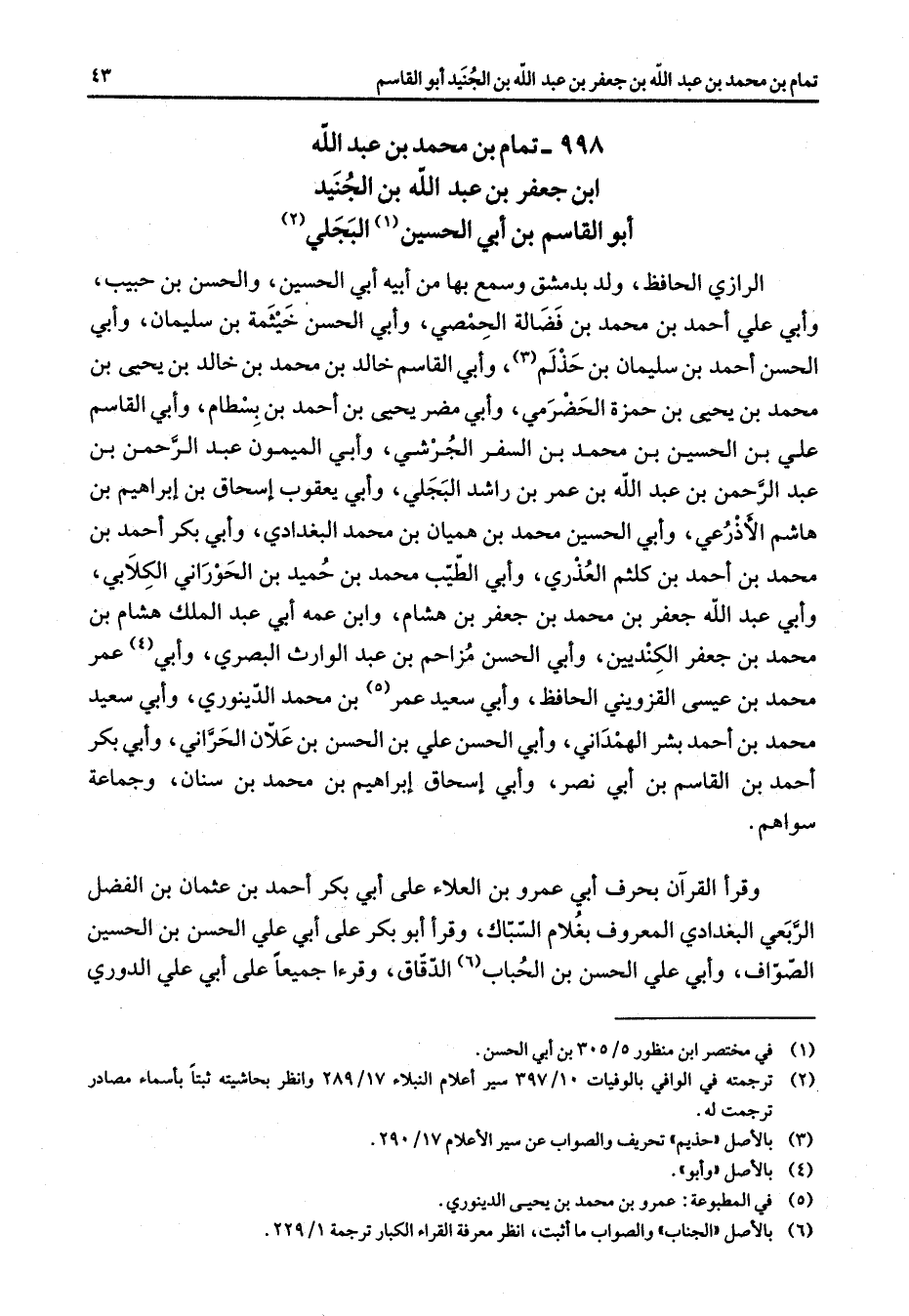 998 - تمام بن محمد بن عبد الله ابن جعفر بن عبد الله بن الجنيد أبو القاسم بن أبي الحسين (1) البجلي (2) الرازي الحافظ ولد بدمشق وسمع بها من أبيه أبي الحسين والحسن بن حبيب وأبي علي أحمد بن محمد بن فضالة الحمصي وأبي الحسن خيثمة بن سليمان وأبي الحسن أحمد بن سليمان بن حذلم (3) وأبي القاسم خالد بن محمد بن خالد بن يحيى بن محمد بن يحيى بن حمزة الحضرمي وأبي مضر يحيى بن أحمد بن بسطام وأبي القاسم علي بن الحسين بن محمد بن السفر الجرشي وأبي الميمون عبد الرحمن بن عبد الرحمن بن عبد الله بن عمر بن راشد البجلي وأبي يعقوب إسحاق بن إبراهيم بن هاشم الأذرعي وأبي الحسين محمد بن هميان بن محمد البغدادي وأبي بكر أحمد بن محمد بن أحمد بن كلثم العذري وأبي الطيب محمد بن حميد بن الحوراني الكلابي وأبي عبد الله جعفر بن محمد بن جعفر بن هشام وابن عمه أبي عبد الملك هشام بن محمد جعفر الكنديين وأبي الحسن مزاحم بن عبد الوارث البصري وأبي (4) عمر محمد بن عيسى القزويني الحافظ وأبي سعيد عمر (5) بن محمد الدينوري وأبي سعيد محمد بن أحمد بشر الهمداني وأبي الحسن علي بن الحسن بن علان الحراني وأبي بكر أحمد بن القاسم بن أبي نصر وأبي إسحاق إبراهيم بن محمد بن سنان وجماعة سواهم وقرأ القرآن بحرف أبي عمرو بن العلاء علي أبي بكر أحمد بن عثمان بن الفضل الربعي البغدادي المعروف بغلام السباك وقرأ أبو بكر على أبي علي الحسن بن الحسين الصواف وأبي علي الحسن بن الحباب (6) الدقاق وقرءا جميعا على أبي علي الدوري