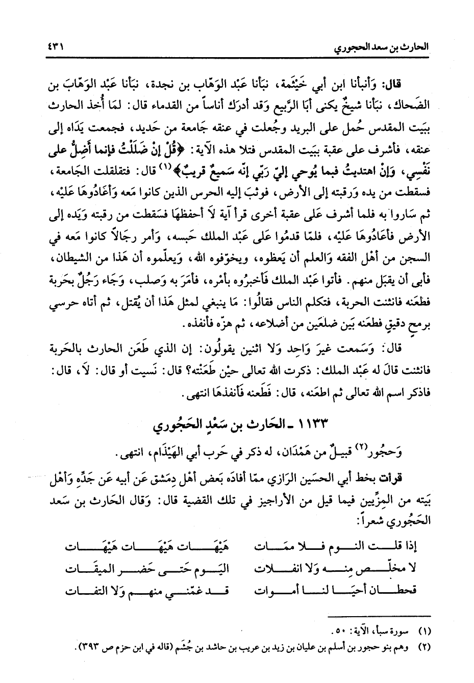 1133 - الحارث بن سعد الحجوري وحجور (2) قبيل من همدان له ذكر في حرب أبي الهيذام انتهى قرأت بخط أبي الحسين الرازي مما أفاده بعض أهل دمشق عن أبيه عن جده وأهل بيته من المزيين فيما قيل من الأراجيز في تلك القضية قال وقال الحارث بن سعد الحجوري شعرا إذا قلت النوم فلا ممات * هيهات هيهات هيهات لا مخلص منه ولا انفلات * اليوم حتى حضر الميقات * * قحطان أحيا لنا أموات * قد غمني منهم ولا التفات * "