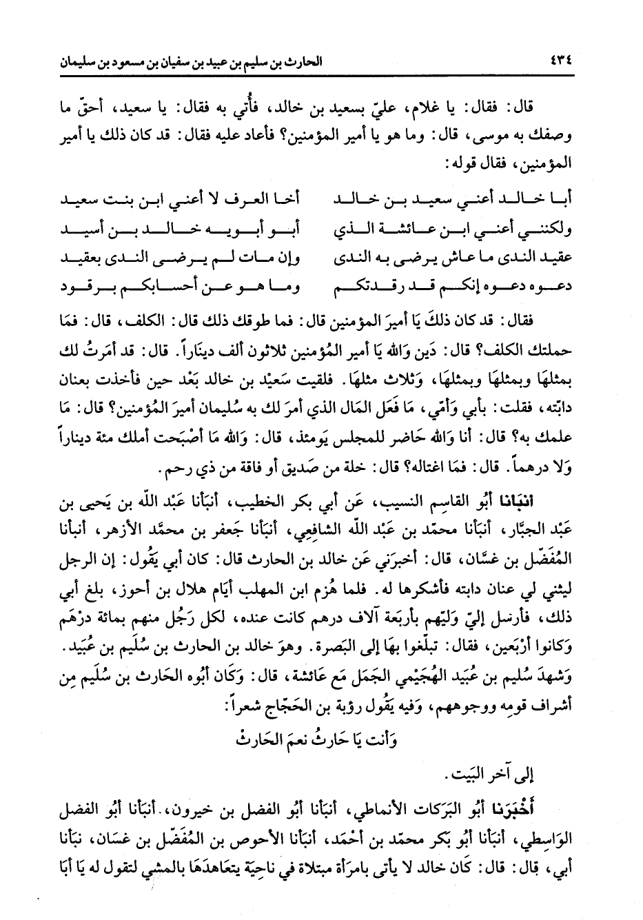 قال فقال يا غلام علي بسعيد بن خالد فأتي به فقال يا سعيد أحق ما وصفك به موسى قال وما هو يا أمير المؤمنين فأعاد عليه فقال قد كان ذلك يا أمير المؤمنين فقال قوله أبا خالد أعني سعيد بن خالد * أخا العرف لا أعني ابن بنت سعيد ولكنني أعني ابن عائشة الذي * أبو أبويه خالد بن أسيد عقيد الندى ما عاش يرضى به الندى * وإن مات لم يرضى الندى بعقيد دعوه دعوه إنكم قد رقدتكم * وما هو عن أحسابكم برقود * فقال قد كان ذلك يا أمير المؤمنين قال فما طوقك ذلك قال الكلف قال فما حملتك الكلف قال دين والله يا أمير المؤمنين ثلاثون ألف دينارا قال قد أمرت لك بمثلها وبمثلها وبمثلها وثلاث مثلها فلقيت سعيد بن خالد بعد حين فأخذت بعنان دابته فقلت بأبي وأمي ما فعل المال الذي أمر لك به سليمان أمير المؤمنين قال ما علمك به قال أنا والله حاضر للمجلس يومئذ قال والله ما أصبحت أملك مئة دينارا ولا درهما قال فما اغتاله قال خلة من صديق أو فاقة من ذي رحم أنبأنا أبو القاسم النسيب عن أبي بكر الخطيب أنبأنا عبد الله بن يحيى بن عبد الجبار أنبأنا محمد بن عبد الله الشافعي أنبأنا جعفر بن محمد الأزهر أنبأنا المفضل بن غسان قال أخبرني عن خالد بن الحارث قال كان أبي يقول إن الرجل ليثني لي عنان دابته فأشكرها له فلما هزم ابن المهلب أيام هلال بن أحوز بلغ أبي ذلك فأرسل إلي وليهم بأربعة آلاف درهم كانت عنده لكل رجل منهم بمائة درهم وكانوا أربعين فقال تبلغوا بها إلى البصرة وهو خالد بن الحارث بن سليم بن عبيد وشهد سليم بن عبيد الهجيمي الجمل مع عائشة قال وكان أبوه الحارث بن سليم من أشراف قومه ووجوههم وفيه يقول رؤبة بن الحجاج شعرا وأنت يا حارث نعم الحارث إلى آخر البيت أخبرنا أبو البركات الأنماطي أنبأنا أبو الفضل بن خيرون أنبأنا أبو الفضل الواسطي أنبأنا أبو بكر محمد بن أحمد أنبأنا الأحوص بن المفضل بن غسان نبأنا أبي قال قال كان خالد لا يأتي بامرأة مبتلاة في ناحية يتعاهدها بالمشي لتقول له يا أبا