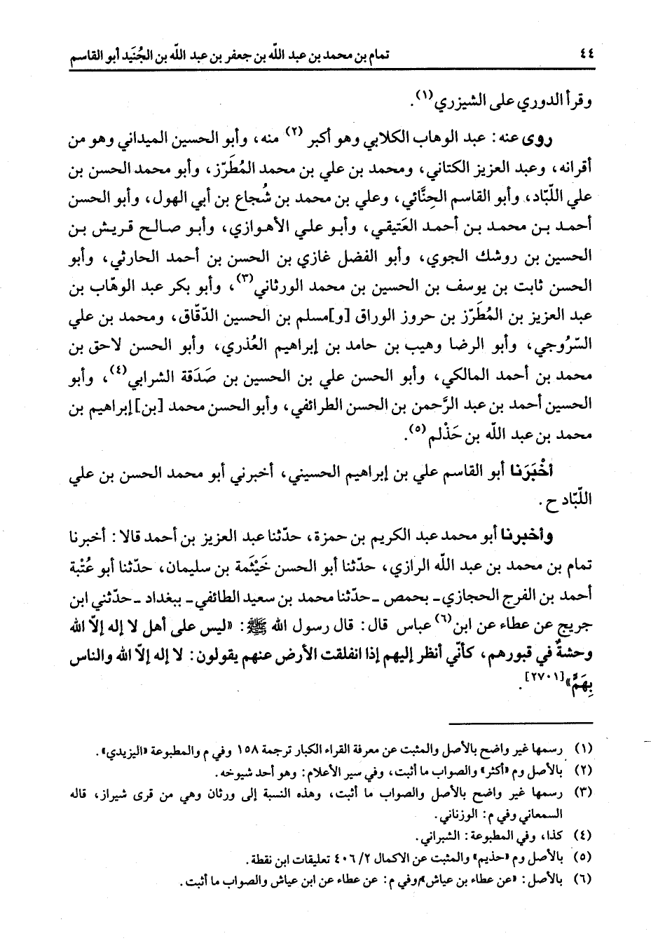 وقرأ الدوري على الشيزري (1) روى عنه عبد الوهاب الكلابي وهو أكبر (2) منه وأبو الحسين الميداني وهو من أقرانه وعبد العزيز الكتاني ومحمد بن علي بن المطرز وأبو محمد الحسن بن علي اللباد وأبو القاسم الحنائي وعلي بن محمد بن شجاع بن أبي الهول وأبو الحسن أحمد بن محمد بن أحمد العتيقي وأبو علي الأهوازي وأبو صالح قريش بن الحسين بن روشك الجوي وأبو الفضل غازي بن الحسن بن أحمد الحارثي وأبو الحسن ثابت بن يوسف بن الحسين بن محمد الورثاني (3) وأبو بكر عبد الوهاب بن عبد العزيز بن المطرز بن حروز الوراق ومسلم بن الحسين الدقاق ومحمد بن علي السروجي وأبو الرضا وهيب بن حامد بن إبراهيم العذري وأبو الحسن لاحق بن محمد بن أحمد المالكي وأبو الحسن علي بن الحسين بن صدقة الشرابي وأبو الحسين أحمد بن عبد الرحمن بن الحسن الطرائفي وأبو الحسن محمد بن إبراهيم بن محمد بن عبد الله بن حذلم (5) أخبرنا أبو القاسم علي بن إبراهيم الحسيني أخبرني أبو محمد الحسن بن علي اللبادح وأخبرنا أبو محمد عبد الكريم بن حمزة حدثنا عبد العزيز بن أحمد قالا أخبرنا تمام بن محمد بن عبد الله الرازي حدثنا أبو الحسن خيثمة بن سليمان حدثنا أبو عتبة أحمد بن الفرج الحجازي بحمص حدثنا محمد بن سعيد الطائفي ببغداد حدثني ابن جريج عن عطاء عن ابن (6) عباس قال قال رسول الله (صلى الله عليه وسلم) ليس على أهل لا إله إلا الله وحشة في قبورهم كأني أنظر إليهم إذا انفلقت الأرض عنهم يقولون لا إله إلا الله والناس بهم