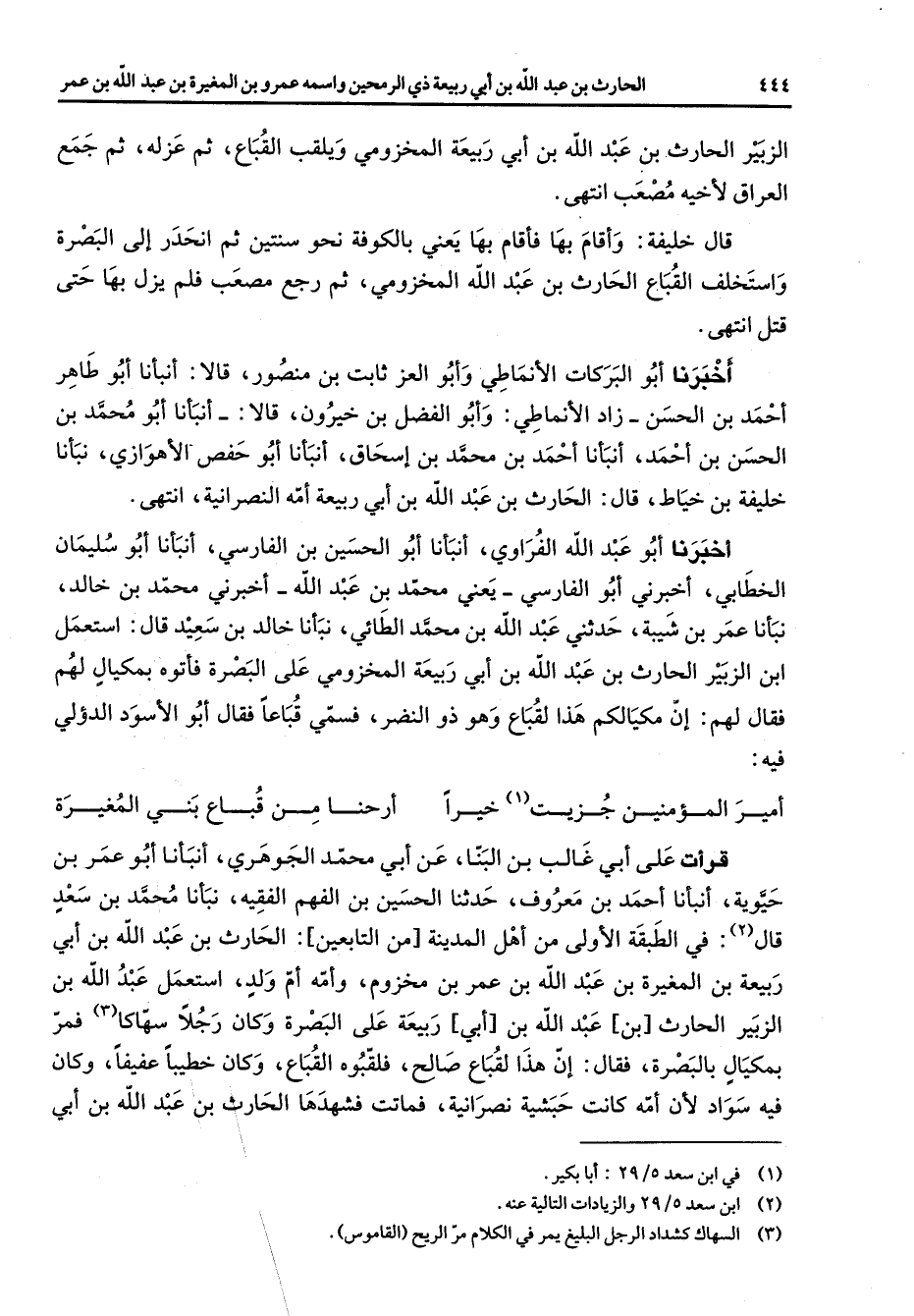 الزبير الحارث بن عبد الله بن أبي ربيعة المخزومي ويلقب القباع ثم عزله ثم جمع العراق لأخيه مصعب انتهى قال خليفة وأقام بها فأقام بها يعني بالكوفة نحو سنتين ثم انحدر إلى البصرة واستخلف القباع الحارث بن عبد الله المخزومي ثم رجع مصعب فلم يزل بها حتى قتل انتهى أخبرنا أبو البركات الأنماطي وأبو العز ثابت بن منصور قالا أنبأنا أبو طاهر أحمد بن الحسن زاد الأنماطي وأبو الفضل بن خيرون قالا أنبأنا أبو محمد بن الحسن بن أحمد أنبأنا أحمد بن محمد بن إسحاق أنبأنا أبو حفص الأهوازي نبأنا خليفة بن خياط قال الحارث بن عبد الله بن أبي ربيعة أمه النصرانية انتهى أخبرنا أبو عبد الله الفراوي أنبأنا أبو الحسين بن الفارسي أنبأنا أبو سليمان الخطابي أخبرني أبو الفارسي يعني محمد بن عبد الله أخبرني محمد بن خالد نبأنا عمر بن شيبة حدثني عبد الله بن محمد الطائي نبأنا خالد بن سعيد قال استعمل ابن الزبير الحارث بن عبد الله بن أبي ربيعة المخزومي على البصرة فأتوه بمكيال لهم فقال لهم إن مكيالكم هذا لقباع وهو ذو النضر فسمي قباعا أبو الأسود الدؤلي فيه أمير المؤمنين جزيت (1) خيرا * أرحنا من قباع بني المغيرة * قرأت على أبي غالب بن البنا عن أبي محمد الجوهري أنبأنا أبو عمر بن حيوية أنبأنا أحمد بن معروف حدثنا الحسين بن الفهم الفقيه نبأنا محمد بن سعد قال (2) في الطبقة الأولى من أهل المدينة من التابعين الحارث بن عبد الله بن أبي ربيعة بن المغيرة بن عبد الله بن عمر بن مخزوم وأمه أم ولد استعمل عبد الله بن الزبير الحارث بن عبد الله بن أبي ربيعة على البصرة وكان رجلا سهاكا (3) فمر كيال بالبصرة فقال إن هذا لقباع صالح فلقبوه القباع وكان خطيبا عفيفا وكان فيه سواد لأن أمه كانت حبشية نصرانية فماتت فشهدها الحارث بن عبد الله بني أبي