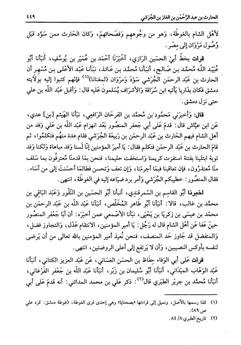 لأهل الشام بالغوطة وهو من وجوههم وفصحائهم وكان الحارث من سود قبل وصول مروان إلى مصر قرأت بخط أبي الحسين الرازي أخبرنا أحمد بن عمير بن يوسف أنبأنا أبو عبيد الله محمد بن صالح أنبأنا محمد بن عائذ نبأنا عبد الأعلى بن مسهر أن الحارث بن عبد الرحمن الجرشي سود ومروان لمغنانا (1) فإنهم كتبوا إليه بولايته دمشق فكان بداريا يأتيه ابن سراقة والأشراف يسلمون عليه قال وأقبل عبد الله بن علي حتى نزل دمشق قال وأخبرني محمود بن محمد بن الفرحان الرافعي نبأنا الهيثم بن عدي عن ابن عياش قال قدم علي أبي جعفر المنصور بعد انهزام عبد الله بن علي وفد من أهل الشام فيهم الحارث بن عبد الرحمن بن ربيعة الجرشي فقام عدة منهم فتكلوا ثم قام الحارث بن عبد الرحمن فتكلم فقال يا أمير المؤمنين إنا لسنا وفد مباهاة ولكنا وفد توبة ابتلينا بفتنة استفزت كريمنا واستخفت حليمنا فنحن بما قدمنا معترفون بما سلف منا معتذرون فإن تعاقبنا فبما أجرمنا وإن تعف وتحسن فطالما أحسنت إلى من أساء فقال المنصور خطيبكم الجرشي وأمر برد ضياعه إليه في الغوطة انتهى أخبرنا أبو القاسم بن السمرقندي أنبأنا أبو الحسين بن النقور وعبد الباقي بن محمد بن غالب قالا أنبأنا أبو طاهر المخلص أنبأنا عبد الله بن عبد الرحمن بن محمد بن عيسى بن زكريا بن يحيى نبأنا الأصمعي عمن أخبره أن أبا جعفر المنصور حين عفا عن أهل الشام قال له رجل يا أمير المؤمنين الإنتقام عدل والتجاوز فضل والمتفضل قد جاوز حد المنصف فنحن نعيذ أمير المؤمنين بالله تعالى من أن يرضى لنفسه بأوكس النصيبين وأن لا يرتفع إلى أعلى الروضتين انتهى قرأت على أبي الوفاء حفاظ بن الحسن الغساني عن عبد العزيز الكتاني أنبأنا عبد الوهاب الميداني أنبأنا أبو سليمان بن زبر أنبأنا عبد الله بن جعفر الفرغاني أنبأنا محمد بن جرير الطبري قال (2) ذكر علي بن محمد المدائني أنه قدم على أبي