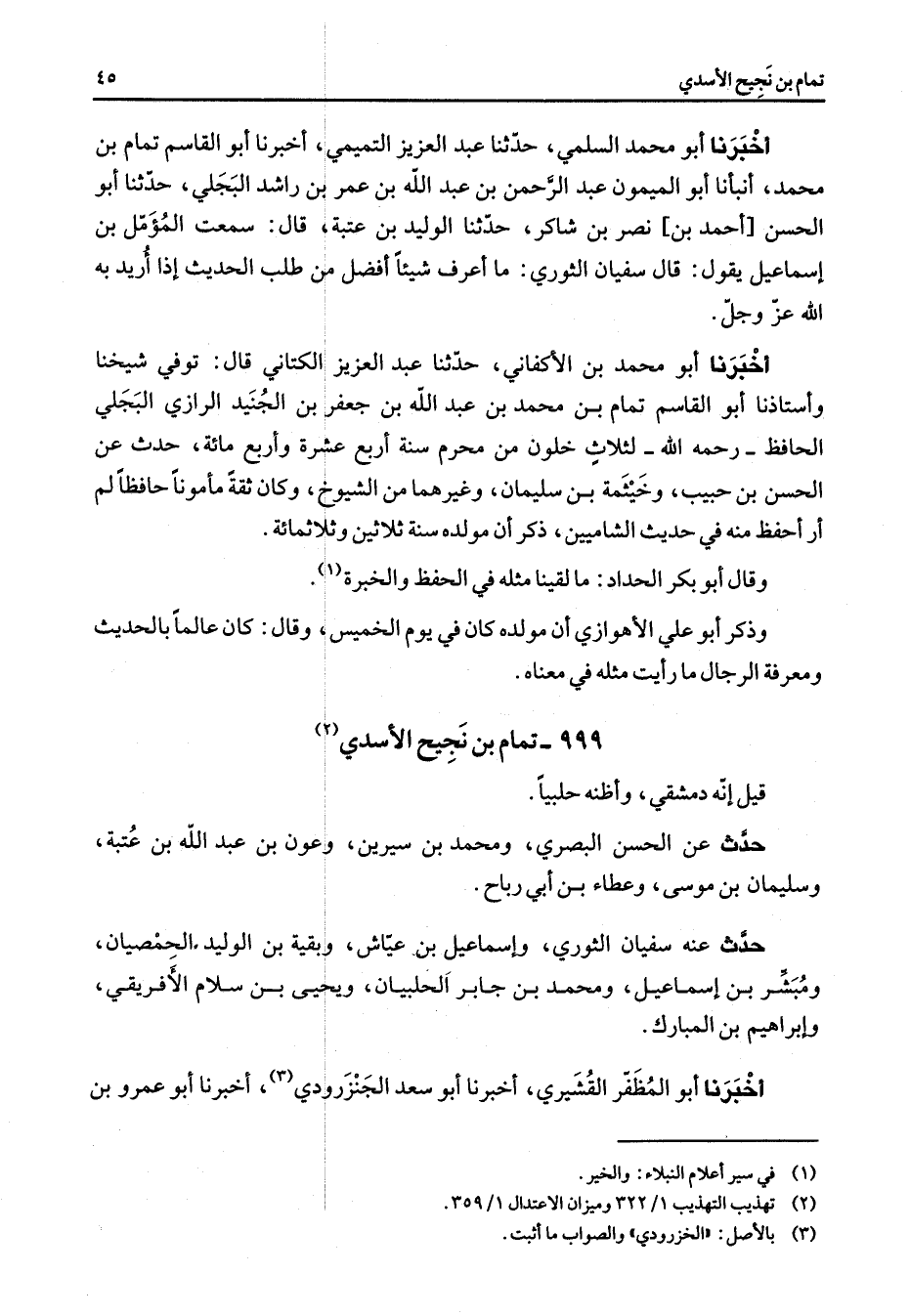 999 - تمام بن نجيح الأسدي (2) قيل إنه من دمشقي وأظنه حلبيا حدث عن الحسن البصري ومحمد بن سيرين وعون بن عبد الله بن عتبة وسليمان بن موسى وعطاء بن أبي رباح حدث عنه سفيان الثوري وإسماعيل بن عياش وبقية بن الوليد الحمصيان ومبشر بن إسماعيل ومحمد بن جابر الحلبيان ويحيى بن سلام الأفريقي وإبراهيم بن المبارك أخبرنا أبو المظفر القشيري أخبرنا أبو سعد الجنزرودي (3) أخبرنا أبو عمرو بن