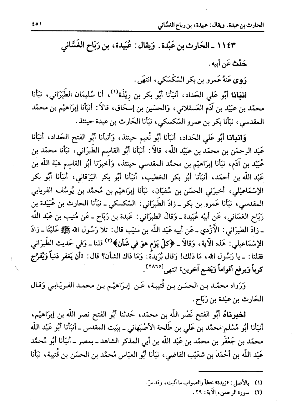 1143 - الحارث بن عبدة ويقال عبيدة بن رباح الغساني حدث عن أبيه روى عنه عمرو بن بكر السكسكي انتهى أنبانا أبو علي الحداد أنبأنا أبو بكر بن ريذة (1) أنا سليمان الطبراني نبأنا محمد بن عبيد بن آدم العسقلاني والحسين بن إسحاق قالا أنبأنا إبراهيم بن محمد المقدسي نبأنا بكر بن عمرو السكسكي نبأنا الحارث بن عبدة حينئذ وأنبأنا أبو علي الحداد أنبأنا أبو نعيم حينئذ وأنبأنا أبو الفتح الحداد أنبأنا عبد الرحمن بن محمد بن عبيد الله قالا أنبأنا أبو القاسم الطبراني نبأنا محمد بن عبيد بن آدم نبأنا إبراهيم بن محمد المقدسي حينئذ وأخبرنا أبو القاسم هبة الله بن عبد الله بن أحمد أنبأنا أبو بكر الخطيب أنبانا أبو بكر البرقاني أنبأنا أبو بكر الإسماعيلي أخبرني الحسن بن سفيان نبأنا إبراهيم بن محمد بن يوسف الفريابي المقدسي نبأنا عمرو بن بكر زاد الطبراني السكسكي نبأنا الحارث بن عبيدة بن رباح الغساني عن أبيه عبيدة وقال الطبراني عبدة بن رباح عن منيب بن عبد الله زاد الطبراني الأزدي عن أبيه عبد الله بن منيب قال تلا رسول لله (صلى الله عليه وسلم) علينا زاد الإسماعيلي هذه الآية وقالا " كل يوم هو في شأن " قلنا وفي حديث الطبراني فقلنا يا رسول الله ما ذاك وقال بريدة وما ذاك الشأن قال أن يغفر ذنبا ويفرج كربا ويرفع أقواما ويضع آخرين