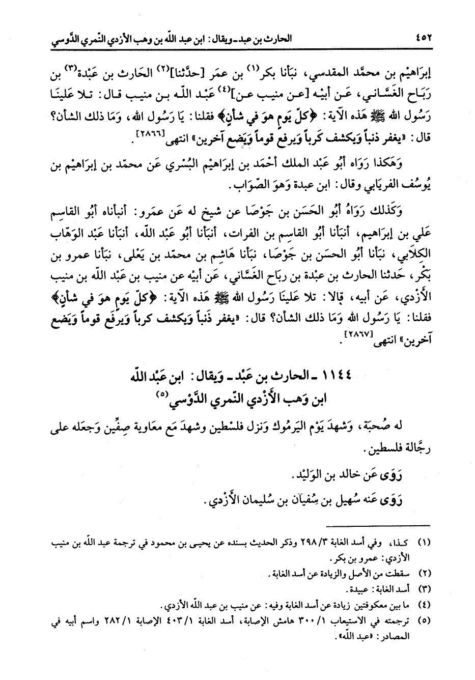 1144 - الحارث بن عبد ويقال ابن عبد الله ابن وهب الأزدي النمري الدوسي (5) له صحبة وشهد يوم اليرموك ونزل فلسطين وشهد مع معاوية صفين وجعله على رجالة فلسطين روى عن خالد بن الوليد روى عنه سهيل بن سفيان بن سليمان الأزدي