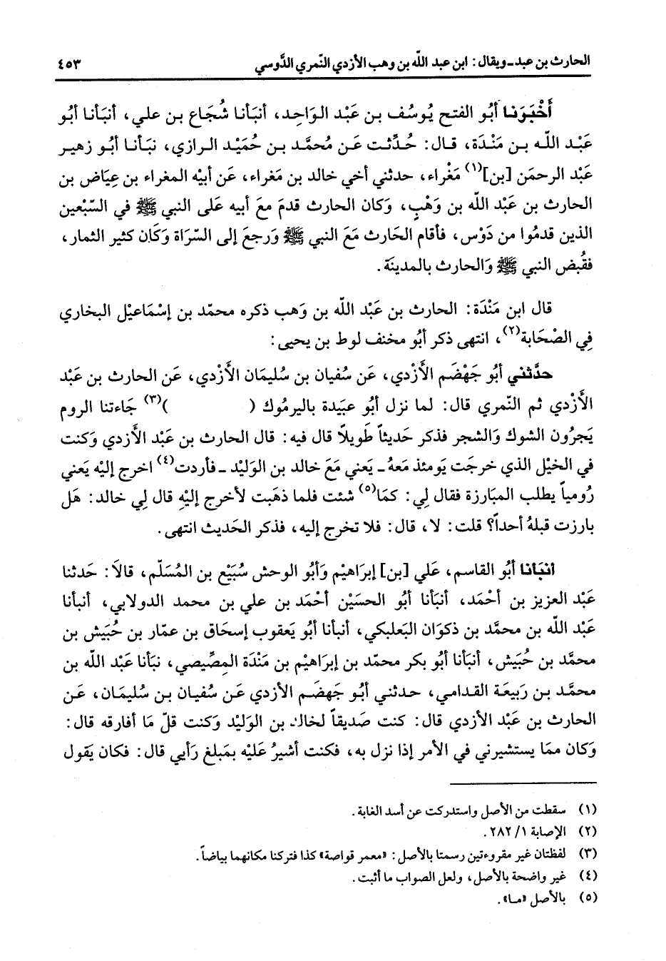 أخبرنا أبو الفتح يوسف بن عبد الواحد أنبأنا شجاع بن علي أنبأنا أبو عبد الله بن مندة قال حدثت عن محمد بن حميد الرازي نبأنا أبو زهير عبدا لرحمن بن (1) مغراء حدثني أخي خالد بن مغراء عن أبيه المغراء بن عياض بن الحارث بن عبد الله بن وهب وكان الحارث قدم مع أبيه على النبي (صلى الله عليه وسلم) في السبعين الذين قدموا من دوس فأقام الحارث مع النبي (صلى الله عليه وسلم) ورجع إلى السراة وكان كثير الثمار فقبض النبي (صلى الله عليه وسلم) والحارث بالمدينة قال ابن مندة الحارث بن عبد الله بن وهب ذكره محمد بن إسماعيل البخاري في الصحابة (2) انتهى ذكر أبو محنف لوط بن يحيى حدثني أبو جهضم الأزدي عن سفيان بن سليمان الأزدي عن الحارث بن عبد الأزدي ثم النمري قال لما نزل أبو عبيدة باليرموك (3) جاءتنا الروم يجرون الشوك والشجر فذكر حديثا طويلا قال فيه قال الحارث بن عبد الأزدي وكنت في الخيل الذي خرجت يومئذ معه يعني مع خالد بن الوليد فأردت (4) اخرج إليه يعني روميا يطلب المبارزة فقال لي كما شئت فلما ذهبت لأخرج إليه قال لي خالد هل بارزت قبله أحدا قلت لا قال فلا تخرج إليه فذكر الحديث انتهى أنبأنا أبو القاسم علي بن إبراهيم وأبو الوحش سبيع بن المسلم قالا حدثنا عبد العزيز بن أحمد أنبأنا أبو الحسين أحمد بن علي بن محمد الدولابي أنبأنا عبد الله بن محمد بن ذكوان البعلبكي أنبأنا أبو يعقوب إسحاق بن عمار بن حبيش بن محمد بن حبيش أنبأنا أبو بكر محمد بن إبراهيم بن مندة المصيصي نبأنا عبد الله بن محمد بن ربيعة القدامي حدثني أبو جهضم الأزدي عن سفيان بن سليمان عن الحارث بن عبد الأزدي قال كنت صديقا لخالد بن الوليد وكنت قل ما أفارقه قال وكان مما يستشيرني في الأمر إذا نزل به فكنت أشير عليه بمبلغ رأيي قال فكان يقول
