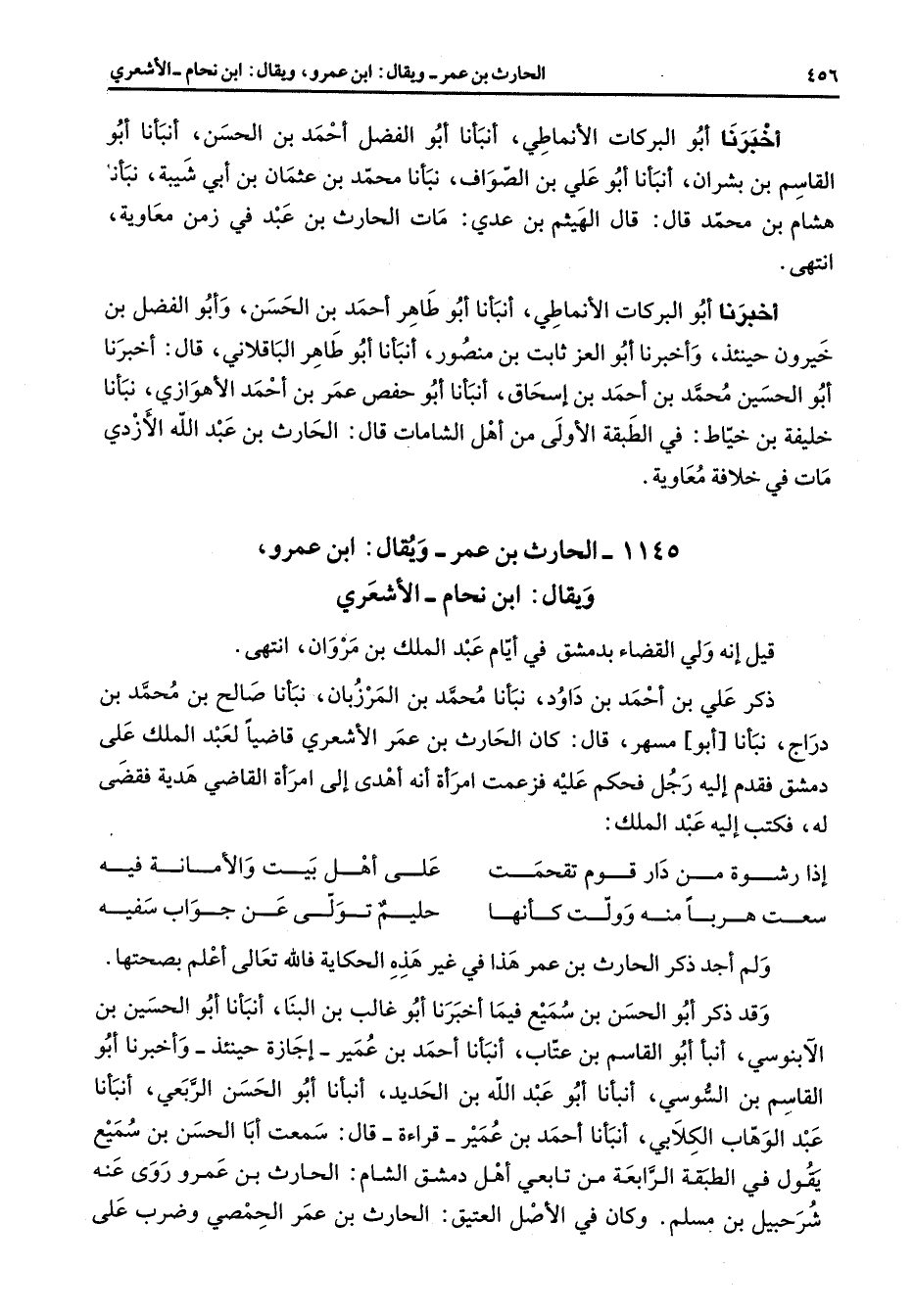 1145 - الحارث بن عمر ويقال ابن عمرو ويقال ابن نحام الأشعري قيل إنه ولي القضاء بدمشق في أيام عبد الملك بن مروان انتهى ذكر علي بن أحمد بن داود نبأنا محمد بن المرزبان نبأنا صالح بن محمد دراج نبأنا أبو مسهر قال كان الحارث بن عمر الأشعري قاضيا لعبد الملك على دمشق فقدم إليه رجل فحكم عليه فزعمت امرأة أنه أهدى إلى امرأة القاضي هدية فقضى له فكتب إليه عبد الملك إذا رشوة من دار قوم تقحمت * على أهل بيت والأمانة فيه سعت هربا منه وولت كأنها * حليم تولى عن جواب سفيه * ولم أجد ذكر الحارث بن عمر هذا في غير هذه الحكاية فالله تعالى أعلم بصحتها وقد ذكر أبو الحسن بن سميع فيما أخبرنا أبو غالب بن البنا أنبأنا أبو الحسين بن الآبنوسي أنبأ أبو القاسم بن عتاب أنبانا أحمد بن عمير إجازة حينئذ وأخبرنا أبو القاسم بن السوسي أنبأنا أبو عبد الله بن الحديد أنبأنا أبو الحسن الربعي أنبأنا عبد الوهاب الكلابي أنبأنا أحمد بن عمير قراءة قال سمعت أبا الحسن بن سميع يقول في الطبقة الرابعة من تابعي أهل دمشق الشام الحارث بن عمرو روى عنه شرحبيل بن مسلم وكان في الأصل العتيق الحارث بن عمر الحمصي وضرب على