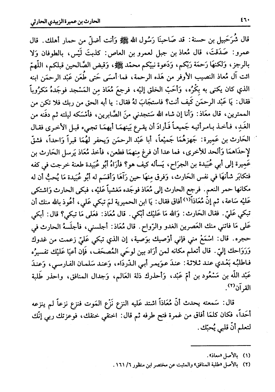 قال شرحبيل بن حسنة قد صاحبنا رسول الله (صلى الله عليه وسلم) وأنت أضل من حمار أهلك قال عمرو صدقت قال معاذ بن جبل لعمرو بن العاص كذبت ليس بالطوفان ولا بالرجز ولكنها رحمة ربكم ودعوة نبيكم محمد (صلى الله عليه وسلم) وقبض الصالحين قبلكم اللهم أئت آل معاذ النصيب الأوفر من هذه الرحمة فما أمسى حتى طعن عبد الرحمن ابنه الذي كان يكنى به بكره وأحب الخلق إليه فرجع معاذ من المسجد فوجده مكروبا فقال يا عبد الرحمن كيف أنت فاستجاب له فقال يا أبه الحق من ربك فلا تكن من لممترين قال معاذ وأنا إن شاء الله ستجدني من الصابرين فأمسكه ليلته ثم دفنه من الغد فأخذ بامرأتيه جميعا فأراد أن يقرع بينهما أيهما تجئ قبل الأخرى فقال الحارث بن عميرة جهزها جميعا أبا عبد الرحمن ويحفر لهما قبرا واحدا فشق لإحداهما والحد للأخرى فما عدا أن فرغ منهما فطعن فأخذ معاذ يرسل الحارث بن عميرة إلى أبي عبيدة بن الجراح يسأله كيف هو فأراه أبو عبيدة طعنه خرجت في كفه فتكابر شأنها في نفس الحارث وفرق منها حين رأها وأقسم له أبو عبيدة ما يحب أن له مكانها حمر النعم فرجع الحارث إلى معاذ فوجده مغشيا عليه فبكى الحارث واشتكى عليه ساعة ثم إن معاذا (1) أفاق فقال يا ابن الحميرية لم تبكي علي أعوذ بالله منك أن تبكي علي فقال الحارث والله ما عليك أبكي قال معاذ فعلى ما تبكي قال أبكي على ما فاتني منك العصرين الغدو والرواح قال معاذ أجلسني فأجلسه الحارث في حجره قال اسمع مني فإني أوصيك بوصية إن الذي تبكي علي زعمت من غدوك ورواحك إلي قال أتعلم مكانه لمن أراد بين لوحي المصحف فإن أعيا عليك تفسيره فاطلبه بعدي عند ثلاثة عند عويمر أبي الدرداء وعند سلمان الفارسي وعند عبد الله بن مسعود بن أم عبد وأحذرك ذلة العالم وجدال المنافق واحذر طلبة القرآن (2) قال سمعته يحدث أن معاذا اشتد عليه النزع نزع الموت فنزع نزعا لم ينزعه أحدا فكان كلما أفاق من غمرة فتح طرفه ثم قال اختقى خنقك فوعزتك ربي إنك لتعلم أن قلبي يحبك