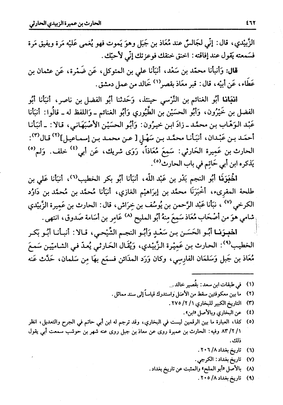 الزبيدي قال إني لجالس عند معاذ بن جبل وهو يموت فهو يغمى عليه مرة ويفيق مرة فسمعته يقول عند إفاقته اخنق خنقك فوعزتك إني لأحبك قال وأنبأنا محمد بن سعد أنبأنا علي بن المتوكل عن ضمرة عن عثمان بن عطاء عن أبيه قال قبر معاذ بقصر (1) خالد من عمل دمشق أنبأنا أبو الغنائم بن النرسي حينئذ وحدثنا أبو الفضل بن ناصر أنبأنا أبو الفضل بن خيرون وأبو الحسين بن الطيوري وأبو الغنائم واللفظ له قالوا أنبأنا عبد الوهاب بن محمد زاد بن خيرون وأبو الحسين الأصبهاني قالا أنبأنا أحمد بن عبدان أنبأنا محمد بن سهل عن محمد بن إسماعيل (2) قال (3) الحارث بن عميرة الحارثي سمع معاذا روى شريك عن أبي (4) خلف ولم (5) يذكره ابن أبي حاتم في باب الحارث اخبرنا أبو النجم بدر بن عبد الله أنبأنا أبو بكر الخطيب (6) أنبأنا علي بن طلحة المقرئ أخبرنا محمد بن إبراهيم الغازي أنبأنا محمد بن محمد بن داود الكرخي (7) نبأنا عبد الرحمن بن يوسف بن خراش قال الحارث بن عميرة الزبيدي شامي هو من أصحاب معاذ سمع منه أبو المليح (8) عامر بن أسامة صدوق انتهى أخبرنا أبو الحسن بن سعد وأبو النجم الشيحي قالا أنبأنا أبو بكر الخطيب (9) الحارث بن عميرة الزبيدي ويقال الحارثي يعد في الشاميين سمع معاذ بن جبل وسلمان الفارسي وكان ورد المدائن فسمع بها من سلمان حدث عنه