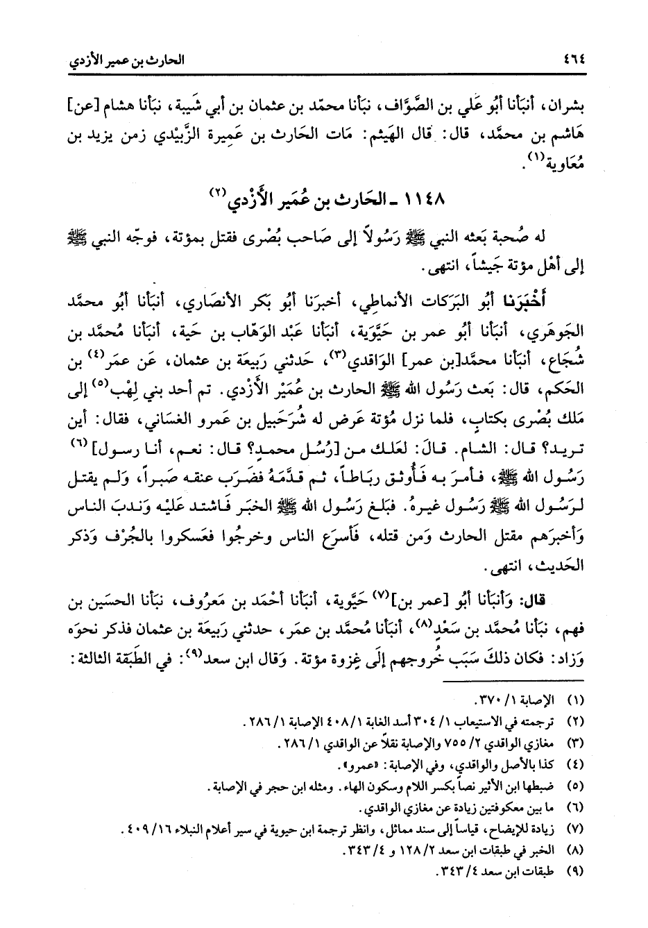 1148 - الحارث بن عمير الأزدي (2) له صحبة بعثه النبي (صلى الله عليه وسلم) رسولا إلى صاحب بصرى فقتل بمؤتة فوجه النبي (صلى الله عليه وسلم) إلى أهل مؤتة جيشا انتهى أخبرنا أبو البركات الأنماطي أخبرنا أبو بكر الأنصاري أنبأنا أبو محمد الجوهري أنبأنا أبو عمر بن حيوية أنبأنا عبد الوهاب بن حية أنبأنا محمد بن شجاع أنبانا محمد بن عمر الواقدي (3) حدثني ربيعة بن عثمان عن عمر (4) بن الحكم قال بعث رسول الله (صلى الله عليه وسلم) الحارث بن عمير الأزدي تم أحد لهب إلى ملك بصرى بكتاب فلما نزل مؤتة عرض له شرحبيل بن عمرو الغساني فقال أين تريد قال الشام قال لعلك من رسل محمد قال نعم أنا رسول (6) رسول الله (صلى الله عليه وسلم) فأمر به فأوثق رباطا ثم قدمه فضرب عنقه صبرا ولم يقتل لرسول الله (صلى الله عليه وسلم) رسول غيره فبلغ رسول الله (صلى الله عليه وسلم) الخبر فاشتد عليه وندب الناس وأخبرهم مقتل الحارث ومن قتله فأسرع الناس وخرجوا فعسكروا بالجرف وذكر الحديث انتهى قال وأنبأنا أبو عمر بن (7) حيوية أنبأنا أحمد بن معروف نبأنا فهم نبأنا محمد بن سعد (8) أنبأنا محمد بن عمر حدثني ربيعة بن عثمان فذكر نحوه وزاد فكان ذلك سبب خروجهم إلى غزوة مؤتة وقال ابن سعد (9) في الطبقة الثالثة