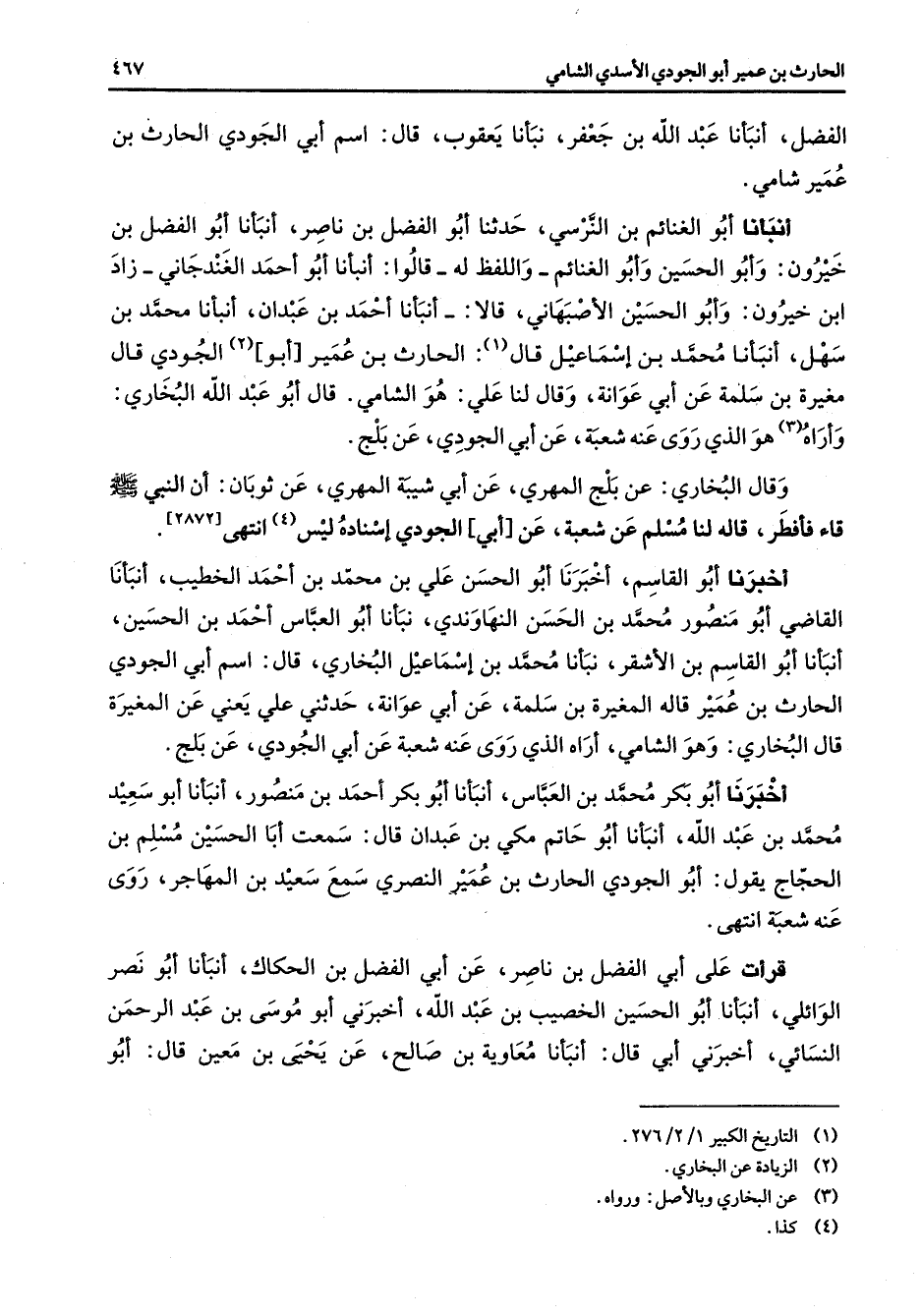 [2872] أخبرنا أبو القاسم أخبرنا أبو الحسن علي بن محمد بن أحمد الخطيب أنبأنا القاضي أبو منصور محمد بن الحسن النهاوندي نبأنا أبو العباس أحمد بن الحسين أنبأنا أبو القاسم بن الأشقر نبأنا محمد بن إسماعيل البخاري قال اسم أبي الجودي الحارث بن عمير قاله المغيرة بن سلمة عن أبي عوانة حدثني علي يعني عن المغيرة قال البخاري وهو الشامي أراه الذي روى عنه شعبة عن أبي الجودي عن بلج أخبرنا أبو بكر محمد بن العباس أنبأنا أبو بكر أحمد بن منصور أنبأنا أبو سعيد محمد بن عبد الله أنبأنا أبو حاتم مكي بن عبدان قال سمعت أبا الحسين مسلم بن الحجاج يقول أبو الجودي الحارث بن عمير النصري سمع سعيد بن المهاجر روى عنه شعبة انتهى قرأت على أبي الفضل بن ناصر عن أبي الفضل بن الحكاك أنبأنا أبو نصر الوائلي أنبأنا أبو الحسين الخصيب بن عبد الله أخبرني أبو موسى بن عبد الرحمن النسائي أخبرني أبي قال أنبأنا معاوية بن صالح عن يحيى بن معين قال أبو
