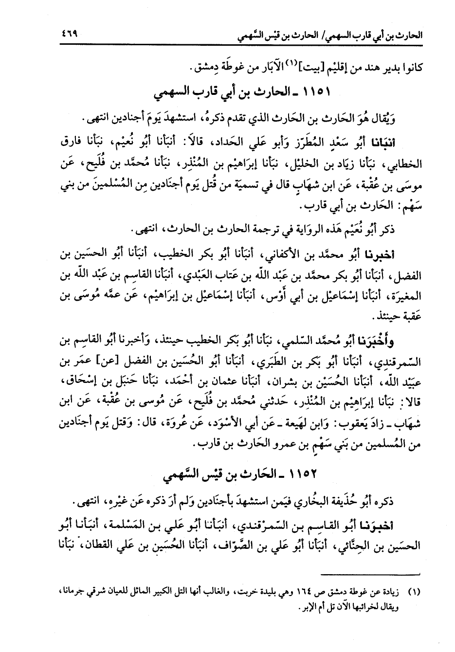 1152 - الحارث بن قيس السهمي ذكره أبو حذيفة البخاري فيمن استشهد بأجنادين ولم أر ذكره عن غيره انتهى أخبرنا أبو القاسم بن السمرقندي أنبأنا أبو علي بن المسلمة أنبأنا أبو الحسين بن الحنائي أنبأنا أبو علي بن الصواف أنبأنا الحسين بن علي القطان نبأنا