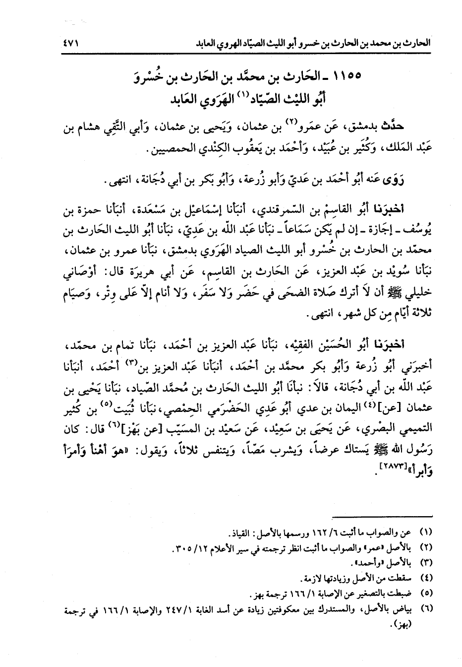 1155 - الحارث بن محمد بن الحارث بن خسرو أبو الليث الصياد (1) الهروي العابد حدث بدمشق عن عمرو (2) بن عثمان ويحيى بن عثمان وأبي التقي هشام بن عبد الملك وكثير بن عبيد وأحمد بن يعقوب الكندي الحمصيين روى عنه أبو أحمد بن عدي وأبو زرعة وأبو بكر بن أبي دجانة انتهى أخبرنا أبو القاسم بن السمرقندي أنبأنا إسماعيل بن مسعدة أنبأنا حمزة بن يوسف إجازة إن لم يكن سماعا نبأنا عبد الله بن عدي نبأنا أبو الليث الحارث بن محمد بن الحارث بن خسرو أبو الليث الصيد الهروي بدمشق نبأنا عمرو بن عثمان نبأنا سويد بن عبد العزيز عن الحارث بن القاسم عن أبي هريرة قال أوصاني خليلي (صلى الله عليه وسلم) أن لا أترك صلاة الضحى في حضر ولا سفر ولا أنام إلا على وتر وصيام ثلاثة أيام من كل شهر انتهى أخبرنا أبو الحسين الفقيه نبأنا عبد العزيز بن أحمد نبأنا تمام بن محمد أخبرني أبو زرعة وأبو بكر محمد بن أحمد أنبأنا عبد العزيز بن (3) أحمد أنبأنا عبد الله بن أبي دجانة قالا نبأنا أبو الليث الحارث بن محمد الصياد نبأنا يحيى بن عثمان عن (4) اليمان بن عدي أبو عدي الحضرمي الحمصي نبأنا ثبيت (5) بن كثير التميمي البصري عن يحيى بن سعيد عن سعيد بن المسيب عن بهز (6) قال كان رسول الله (صلى الله عليه وسلم) يستاك عرضا ويشرب مصا ويتنفس ثلاثا ويقول هو أهنأ وأمرأ وأبرأ