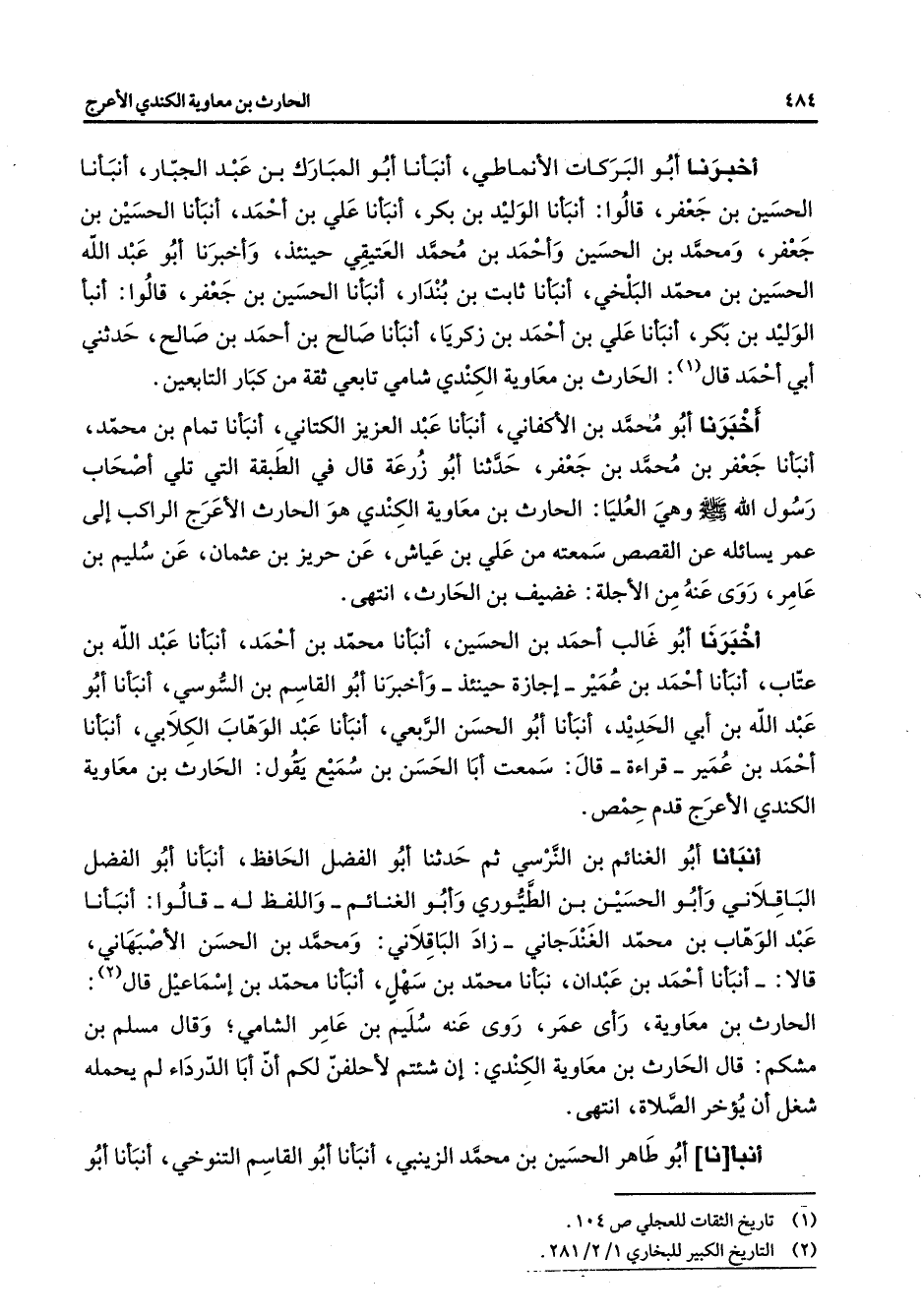 أخبرنا أبو البركات الأنماطي أنبأنا أبو المبارك بن عبد الجبار أنبأنا الحسين بن جعفر قالوا أنبأنا الوليد بن بكر أنبأنا علي بن أحمد أنبانا الحسين بن جعفر ومحمد بن الحسين وأحمد بن محمد العتيقي حينئذ وأخبرنا أبو عبد الله الحسين بن محمد البلخي أنبأنا ثابت بن بندار أنبأنا الحسين بن جعفر قالوا أنبأ الوليد بن بكر أنبأنا علي بن أحمد بن زكريا أنبأنا صالح بن أحمد بن صالح حدثني أبي أحمد قال (1) الحارث بن معاوية الكندي شامي تابعي ثقة من كبار التابعين أخبرنا أبو محمد بن الأكفاني أنبأنا عبد العزيز الكتاني أنبأنا تمام بن محمد أنبأنا جعفر بن محمد بن جعفر حدثنا أبو زرعة قال في الطبقة التي أصحاب رسول الله (صلى الله عليه وسلم) وهي العليا الحارث بن معاوية الكندي هو الحارث الأعرج الراكب إلى عمر يسائله عن القصص سمعته من علي بن عياش عن حريز بن عثمان عن سليم بن عامر روى عنه من الأجلة غضيف بن الحارث انتهى أخبرنا أبو غالب أحمد بن الحسين أنبأنا محمد بن أحمد أنبأنا عبد الله بن عتاب أنبأنا احمد بن عمير إجازة حينئذ وأخبرنا أبو القاسم بن السوسي أنبأنا أبو عبد الله بن أبي الحديد أنبأنا أبو الحسن الربعي أنبأنا عبد الوهاب الكلابي أنبأنا أحمد بن عمير قراءة قال سمعت أبا الحسن بن سميع يقول الحراث بن معاوية الكندي الأعرج قدم حمص أنبأنا أبو الغنائم بن النرسي ثم حدثنا أبو الفضل الحافظ أنبأنا أبو الفضل الباقلاني وأبو الحسين بن الطيوري وأبو الغنائم واللفظ له قالوا أنبانا عبد الوهاب بن محمد الغندجاني زاد الباقلاني ومحمد بن الحسن الأصبهاني قالا أنبانا احمد بن عبدان نبأنا محمد بن سهل أنبانا محمد بن إسماعيل قال (2) الحارث بن معاوية رأى عمر روى عنه سليم بن عامر الشامي وقال مسلم بن مشكم قال الحارث بن معاوية الكندي إن شئتم لأحفلن لكم أن أبا الدرداء لم يحمله شغل أن يؤخر الصلاة انتهى أنبأنا أبو طاهر الحسين بن محمد الزينبي أنبأنا أبو القاسم التنوخي أنبأنا أبو