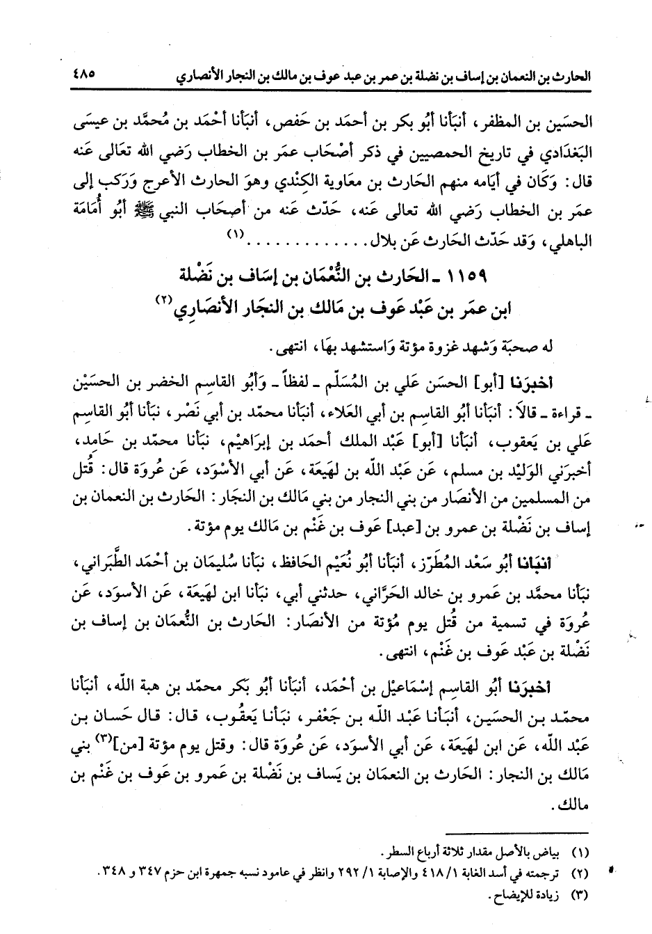 1159 - الحارث بن النعمان بن إساف بن نضلة ابن عمر بن عبد عوف بن مالك بن النجار الأنصاري (2) له صحبة وشهد غزوة مؤتة واستشهد بها انتهى أخبرنا أبو الحسن علي بن المسلم لفظا وأبو القاسم الخضر بن الحسين قراءة قالا أنبأنا أبو القاسم بن أبي العلاء أنبأنا محمد بن أبي نصر نبأنا أبو القاسم علي بن يعقوب أنبأنا أبو عبد الملك أحمد بن إبراهيم نبأنا محمد بن حامد أخبرني الوليد بن مسلم عن عبد الله بن لهيعة عن أبي الأسود عن عروة قال قتل من المسلمين من الأنصار من بني النجار من بني مالك بن النجار الحارث بن النعمان بن إساف بن نضلة بن عمرو بن عبد عوف بن غنم بن مالك يوم مؤتة أنبأنا أبو سعد المطرز أنبأنا أبو نعيم الحافظ نبأنا سليمان بن أحمد الطبراني نبأنا محمد بن عمرو بن خالد الحراني حدثني أبي نبأنا ابن لهيعة عن الأسود عن عروة في تسمية من قتل يوم مؤتة من الأنصار الحارث بن النعمان بن إساف بن نضلة بن عبد عوف بن غنم انتهى أخبرنا أبو القاسم إسماعيل بن أحمد أنبأنا أبو بكر محمد بن هبة الله أنبأنا محمد بن الحسين أنبأنا عبد الله بن جعفر نبأنا يعقوب قال قال حسان بن عبد الله عن ابن لهيعة عن أبي الأسود عن عروة قال وقتل يوم مؤتة من بني مالك بن النجار الحارث بن النعمان بن يساف بن نضلة بن عمرو بن عوف بن غنم بن مالك