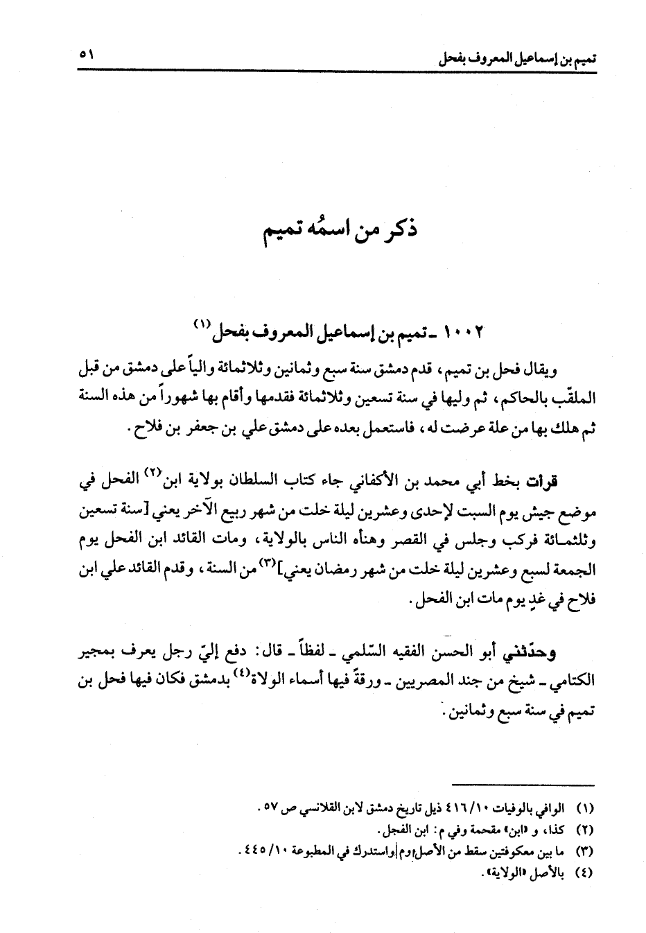1002 - تميم بن إسماعيل المعروف بفحل (1) ويقال فحل بن تميم قدم دمشق سنة سبع وثمانين وثلاثمائة واليا على دمشق من قبل الملقب بالحاكم ثم وليها في سنة تسعين وثلاثمائة فقدمها وأقام بها شهورا من هذه السنة ثم هلك بها من علة عرضت له فاستعمل بعده على دمشق علي بن جعفر بن فلاح قرأت بخط أبي محمد بن الأكفاني جاء كتاب السلطان بولاية ابن (2) الفحل في موضع جيش يوم السبت لإحدى وعشرين ليلة خلت من شهر ربيع الآخر يعني سنة تسعين وثلثمائة فركب وجلس في القصر وهنأه الناس بالولاية ومات القائد ابن الفحل يوم الجمعة لسبع وعشرين ليلة خلت من شهر رمضان يعني (3) من السنة وقدم القائد علي ابن فلاح في غد يوم مات ابن الفحل وحدثني أبو الحسن الفقيه السلمي لفظا قال دفع إلي رجل يعرف بمجير الكتامي شيخ من جند المصريين ورقة فيها أسماء الولاة (4) بدمشق فكان فيها فحل بن تميم في سنة سبع وثمانين