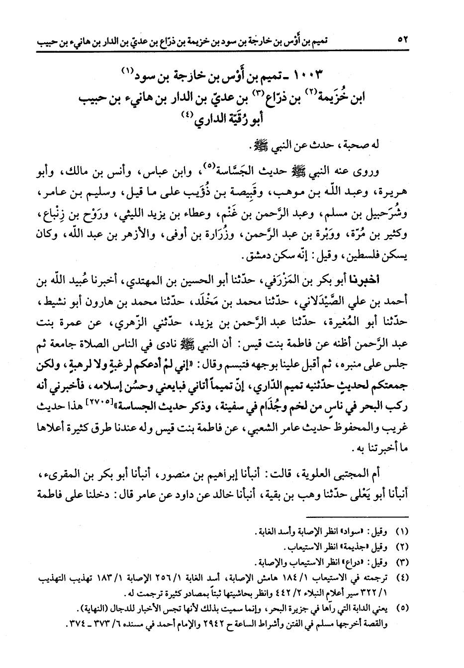 1003 - تميم بن أوس بن خارجة بن سود (1) ابن خزيمة (2) بن ذراع (3) بن عدي بن الدار بن هانئ بن حبيب أبو رقية الداري (4) له صحبة حدث عن النبي (صلى الله عليه وسلم) وروى عنه النبي (صلى الله عليه وسلم) حديث الجساسة (5) وابن عباس وأنس بن مالك وأبو هريرة وعبد الله بن موهب وقبيصة بن ذؤيب على ما قيل وسليم بن عامر وشرحبيل بن مسلم وعبد الرحمن بن غنم وعطاء بن يزيد الليثي وروح بن زنباع وكثير بن مرة ووبرة بن عبد الرحمن وزرارة بن أوفى والأزهر بن عبد الله وكان يسكن فلسطين وقيل إنه سكن دمشق أخبرنا أبو بكر بن المزرفي حدثنا أبو الحسين بن المهتدي أخبرنا عبيد الله بن أحمد بن علي الصيدلاني حدثنا محمد بن مخلد حدثنا محمد بن هارون أبو نشيط حدثنا أبو المغيرة حدثنا عبد الرحمن بن يزيد حدثني الزهري عن عمرة بنت عبد الرحمن أظنه عن فاطمة بنت قيس أن النبي (صلى الله عليه وسلم) نادى في الناس الصلاة جامعه ثم جلس على منبره ثم أقبل علينا بوجهه فتبسم وقال إني لم أدعكم لرغبة ولا لرهبة ولكن جمعتكم لحديث حدثنيه تميم الداري إن تميما أتاني فبايعني وحسن إسلامه فأخبرني أنه ركب البحر في ناس من لخم وجذام في سفينة وذكر حديث الجساسة